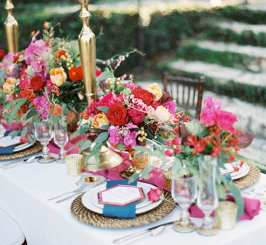 Turn a traditional pink color palette up a notch by using vibrant tones in berry and fuchsia. An ocean-y blue makes the perfect choice as an accent hue to this feminine look.
