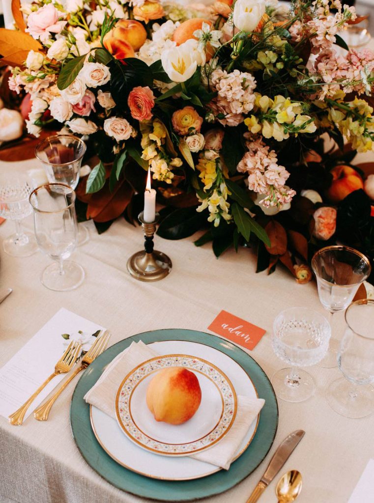 Opt for peach hues paired with soft teal for a Southern soiree! This color combo lends itself to both bright and cheery or moody wedding decor.