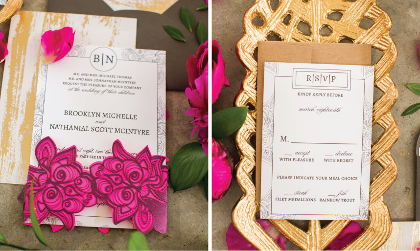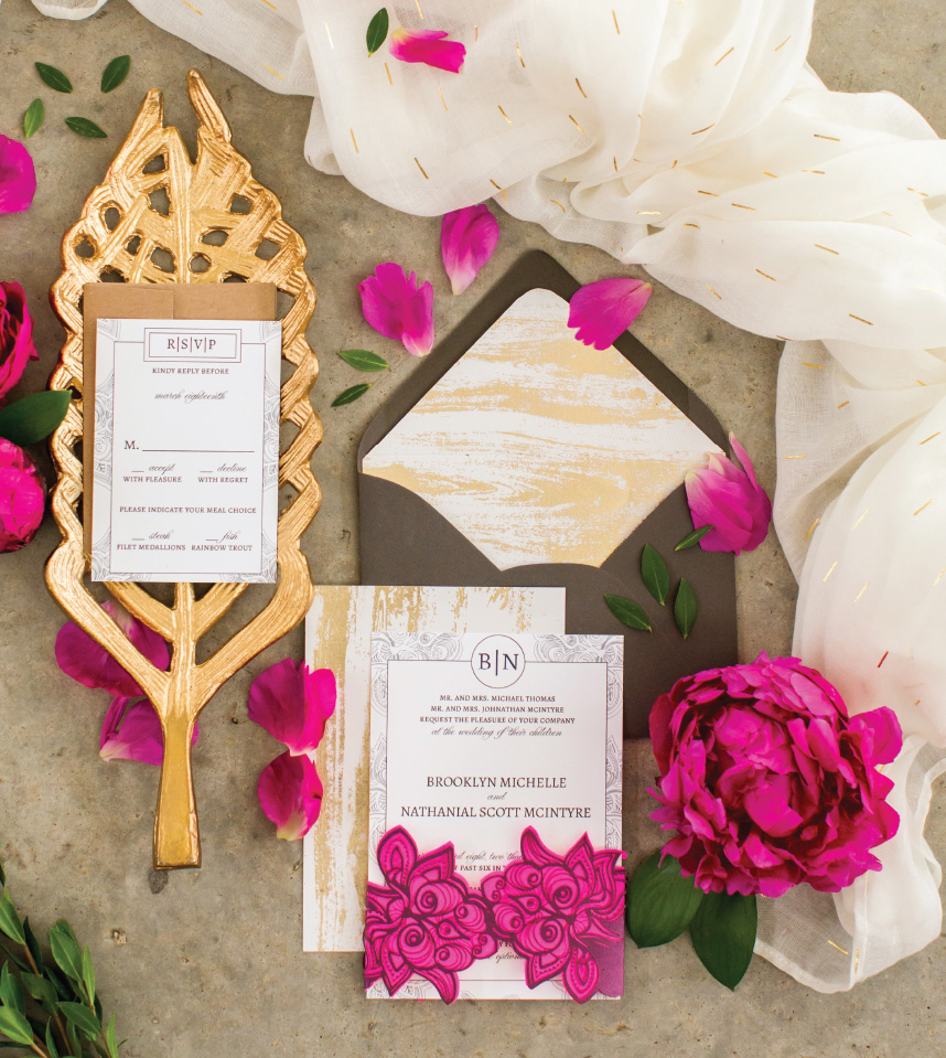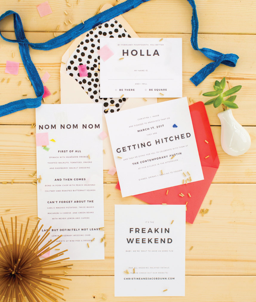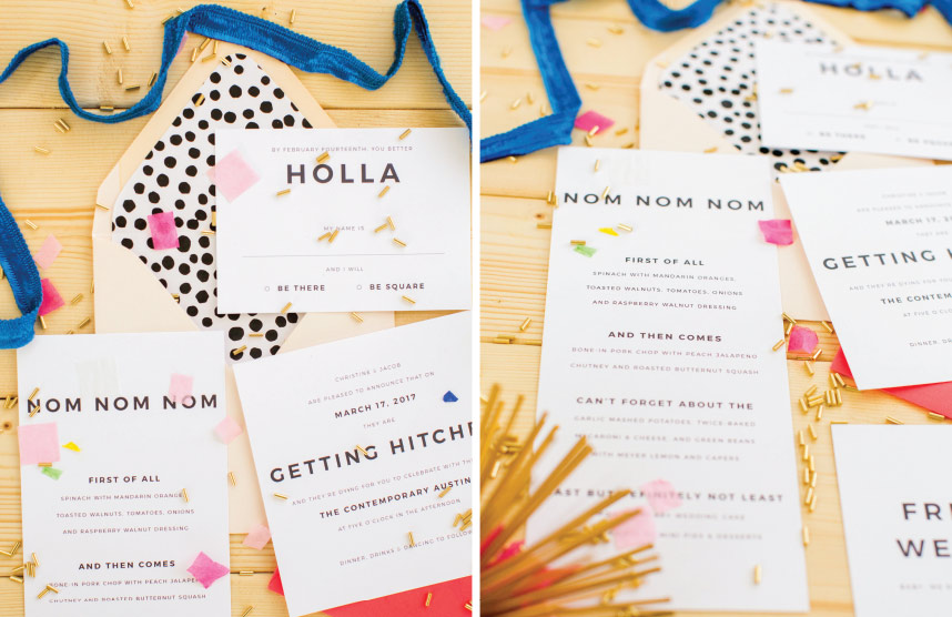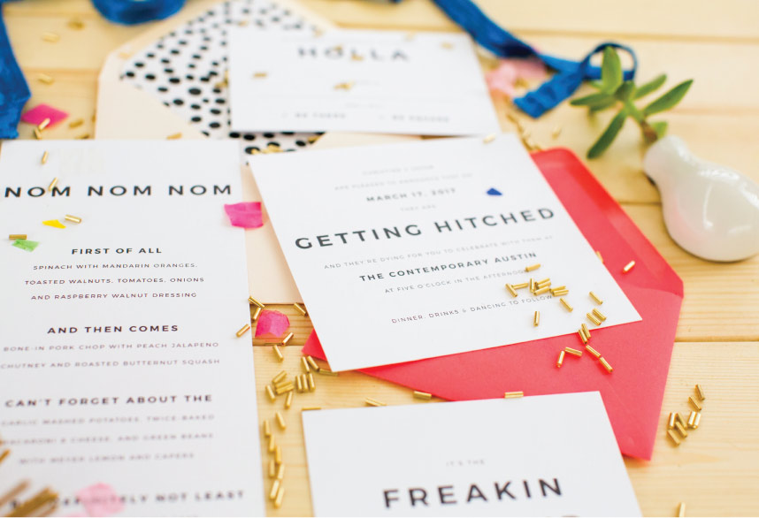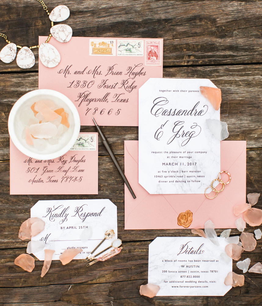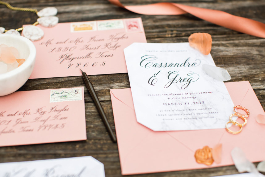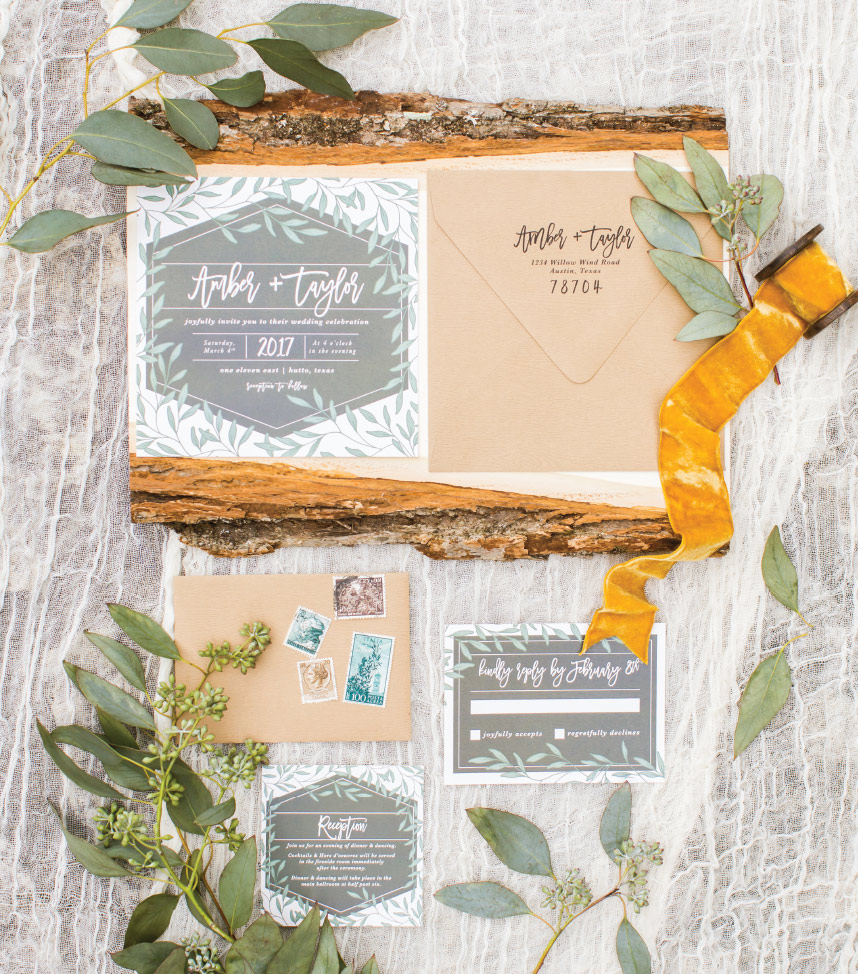 Make the perfect first impression with any of these stylish wedding invitations from local Austin invite designers. We love each unique trend from watercolor and hand illustration to lasercut details and modern typography. Flip to page 86 in the Spring/Summer 2017 issue of Brides of Austin to see these pretties in print! Thanks to Austin wedding photographer Shelley Elena Photography for capturing each invite at the beautiful Barr-Mansion, Ballroom and Farmstead.