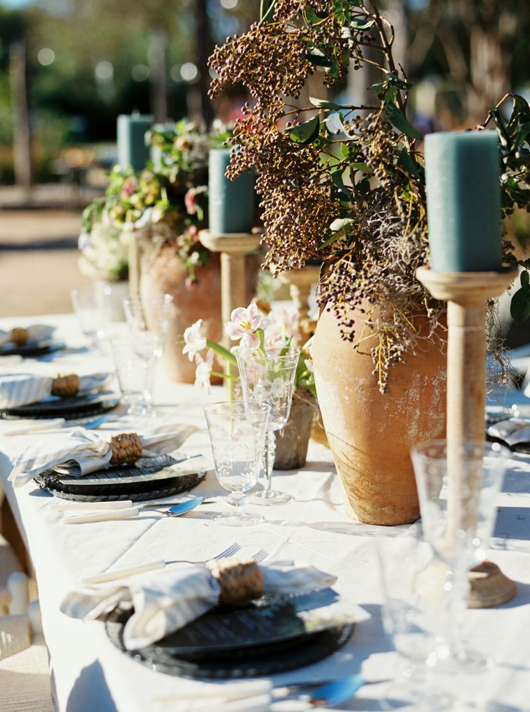 The table design embraced understated luxury with Loot Rentals providing cozy lounge moments and elegant seating featuring woven napkin rings, clear etched glassware, black chargers, and soft striped linens. The addition of large terra cotta urns filled with natural, untamed florals brought texture and dimension to the tablescape.
