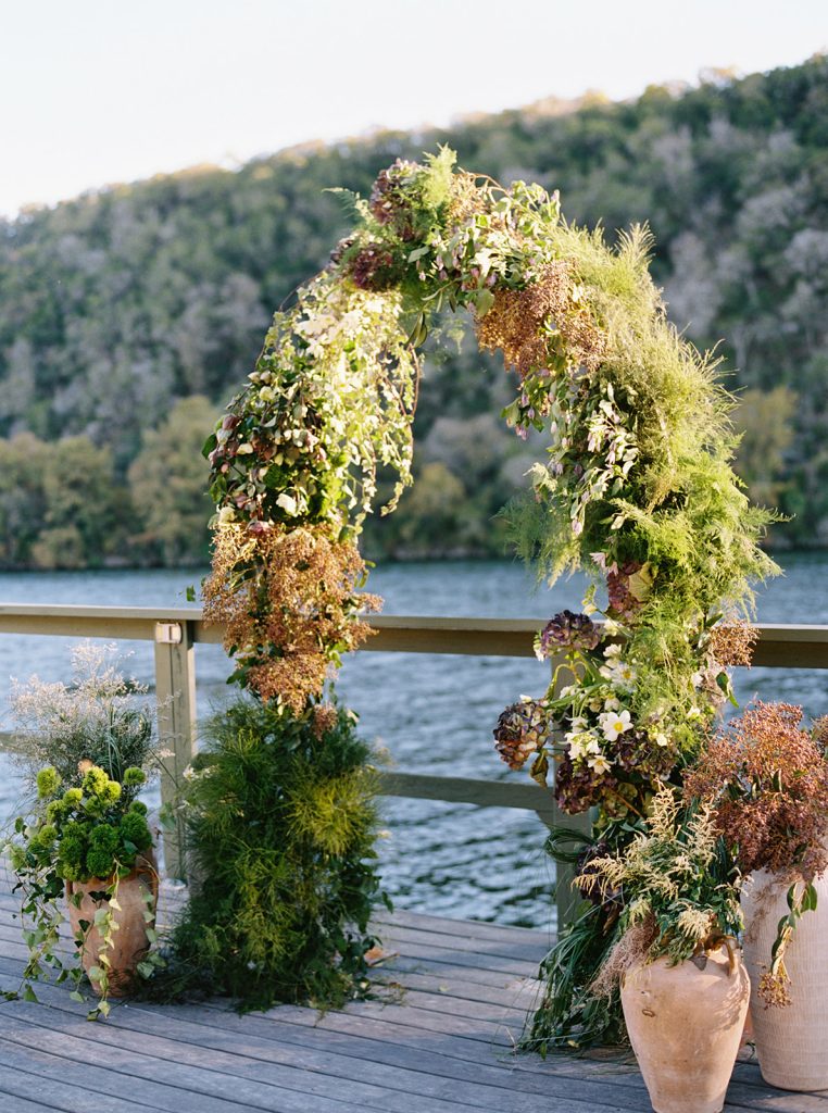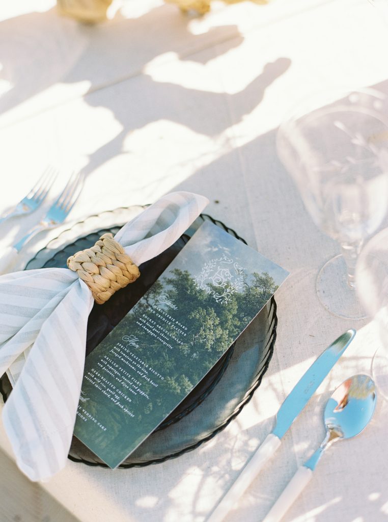 Cojo Moxon created a timeless paper suite with elevated typography and a scenic motif that was echoed throughout the event, including custom menus placed at each setting. The floral arch was an ethereal focal point, styled with wild, foraged greenery and moody, romantic blooms that effortlessly complemented the natural surroundings.