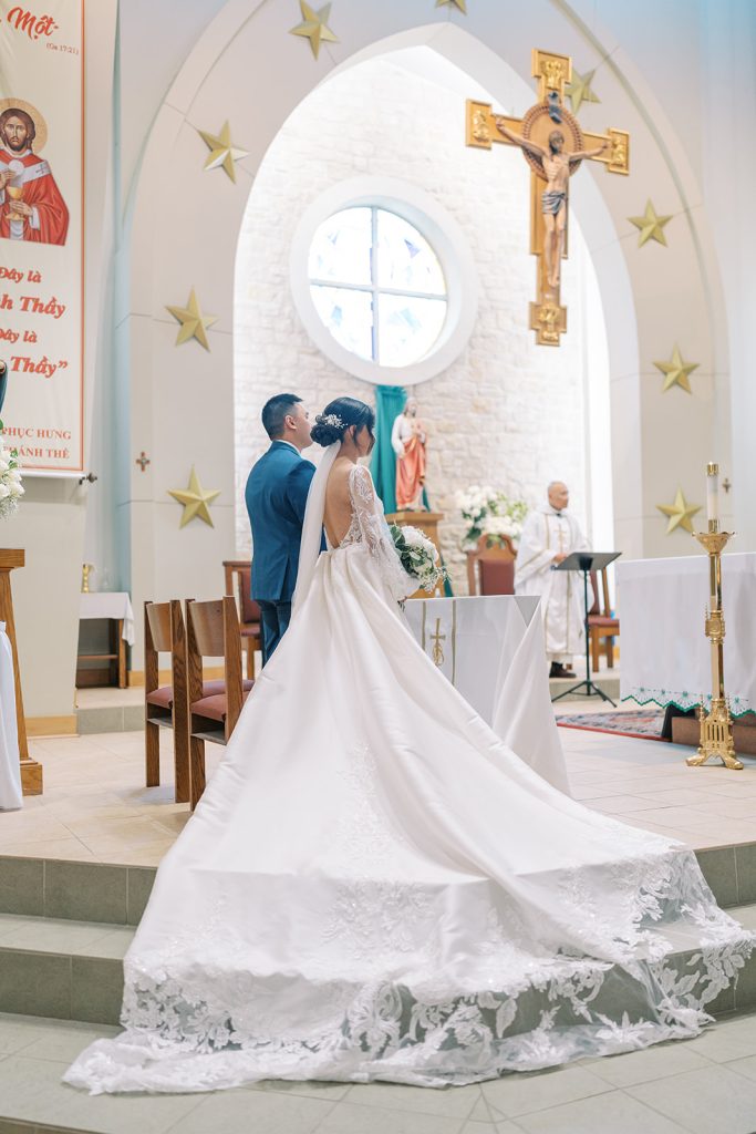 The Phams’ wedding day was a beautiful celebration, steeped in tradition and surrounded by the warmth of family. Held in a stunning Catholic church adorned with elegant green accents, the ceremony was a heartfelt beginning to their new journey.