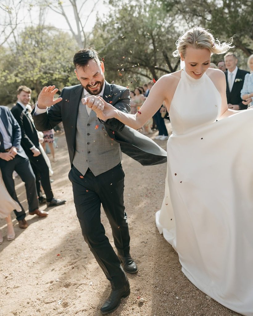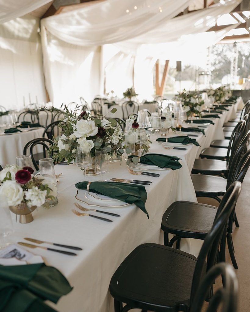 Imogen and Trey’s wedding was a charming nod to old-school elegance, complete with coattails and a classic top hat. A rich palette of red, forest green, and white set the tone, creating a warm and inviting atmosphere filled with timeless style.