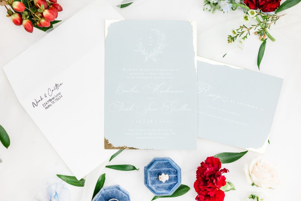 Camp Lucy was the perfect resort wedding venue for Caitlin + Noah’s baby blue and fiery red winter wedding. Explore all the stunning shots preserved through the lenses of Lacey + Lee Photography below!