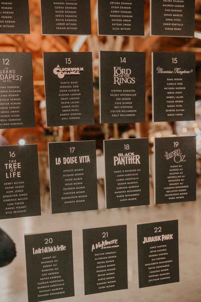 Sabrina & Rehman’s wedding celebration reflected more than their love for each other with an ode to the silver screen. This cinematic tribute stemmed from their love of movies and Rehman’s profession as a movie director and editor. Queue the “theater chart” – a unique personal touch worth recording! Instead of using your traditional seating chart, this couple named each table after some of their favorite films.