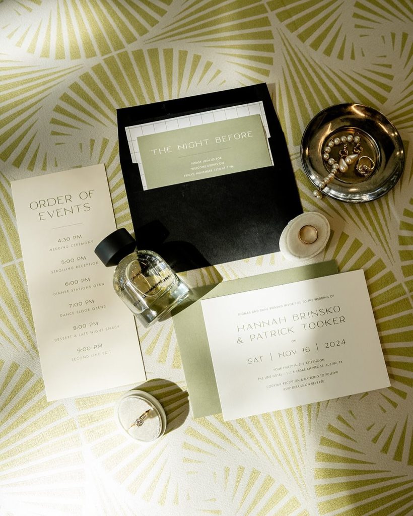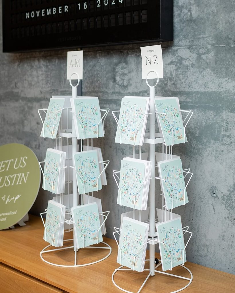 ”Hannah and Patrick’s personal touches were woven throughout the day. Since they did not need a traditional seating chart with a strolling reception – custom postcards featured a map of Austin, highlighting locations special to their relationship, like their first date spot and their home. Each postcard carried a handwritten thank-you note to every guest, expressing the couple’s deep gratitude for their loved ones.” – Amuse Event Co.