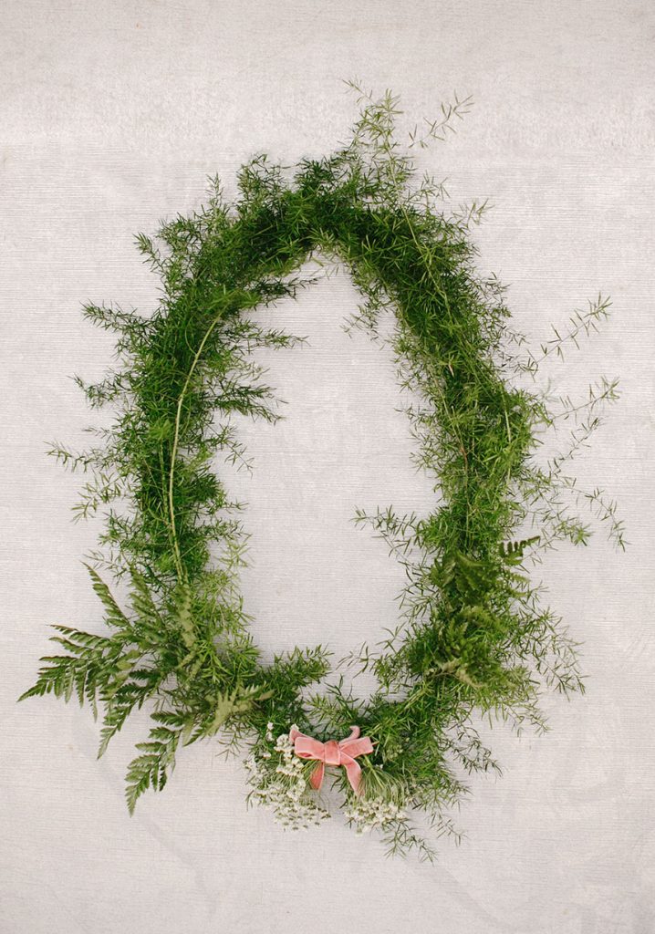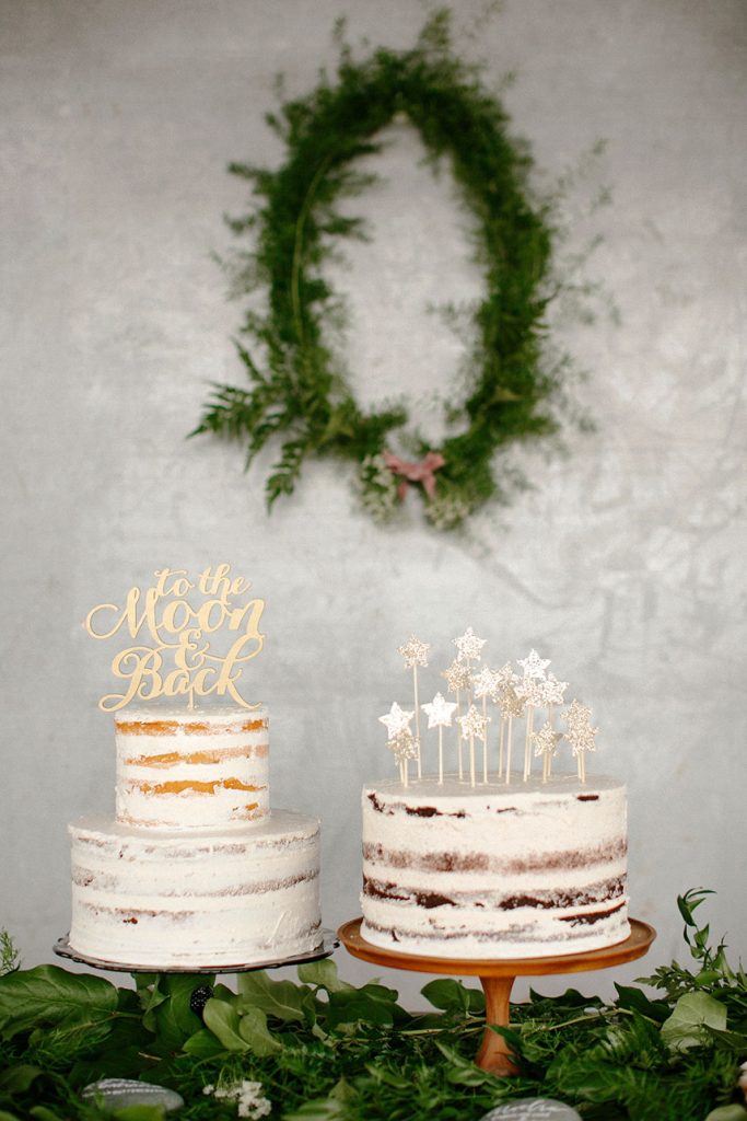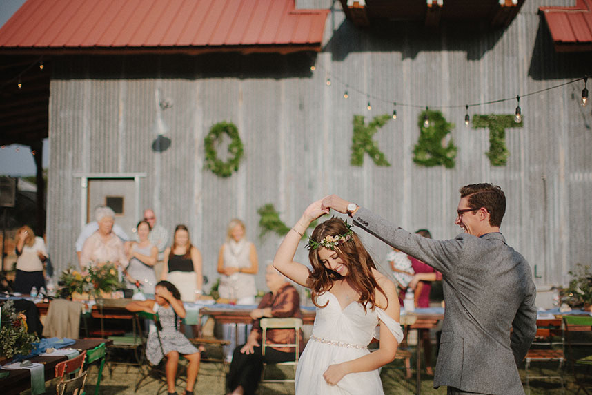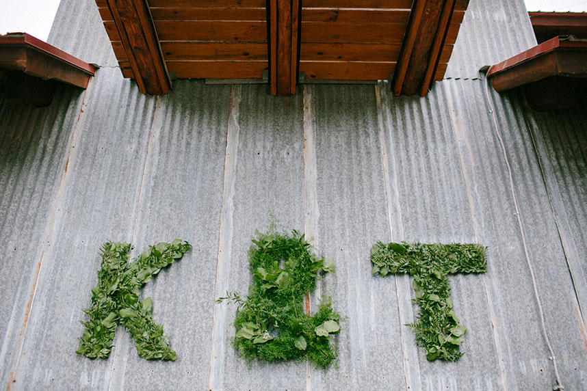 Guests moved to the reception area to sit under café lights that were strung above the reception, casting a faint, warm glow below. Green wreaths and the couple’s initials were hung on a neighboring wall of a building, metal touching greenery to create a personalized, beautiful contrast.