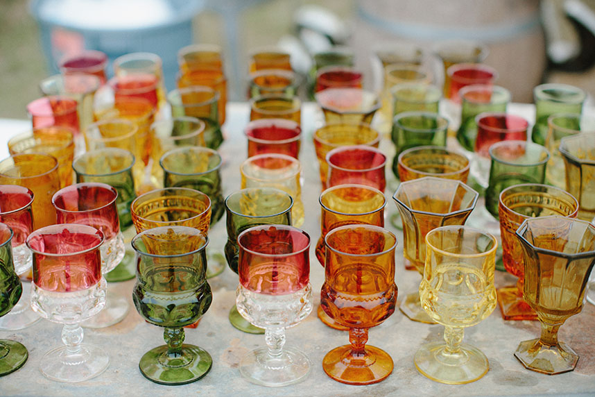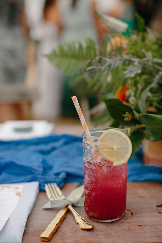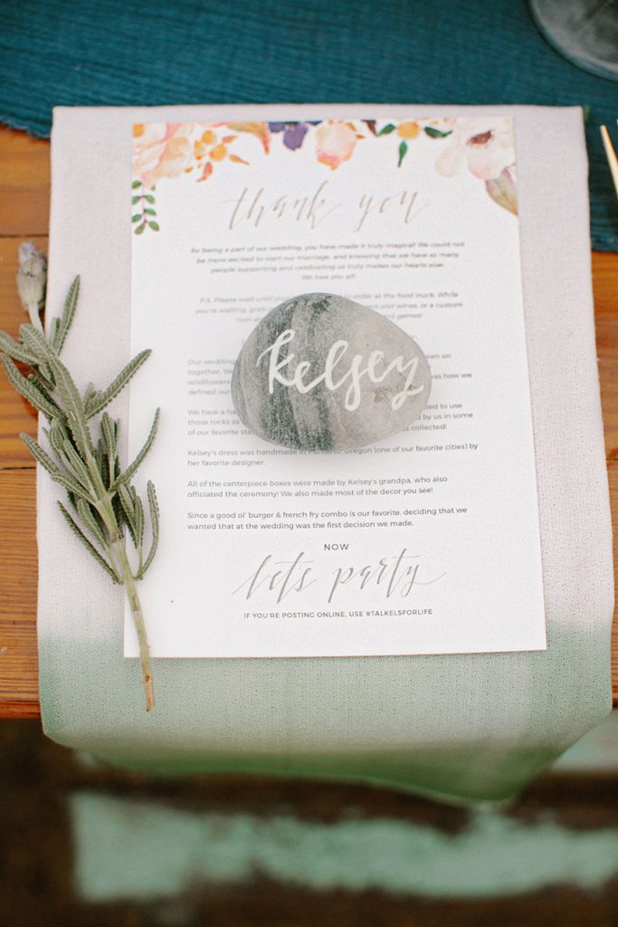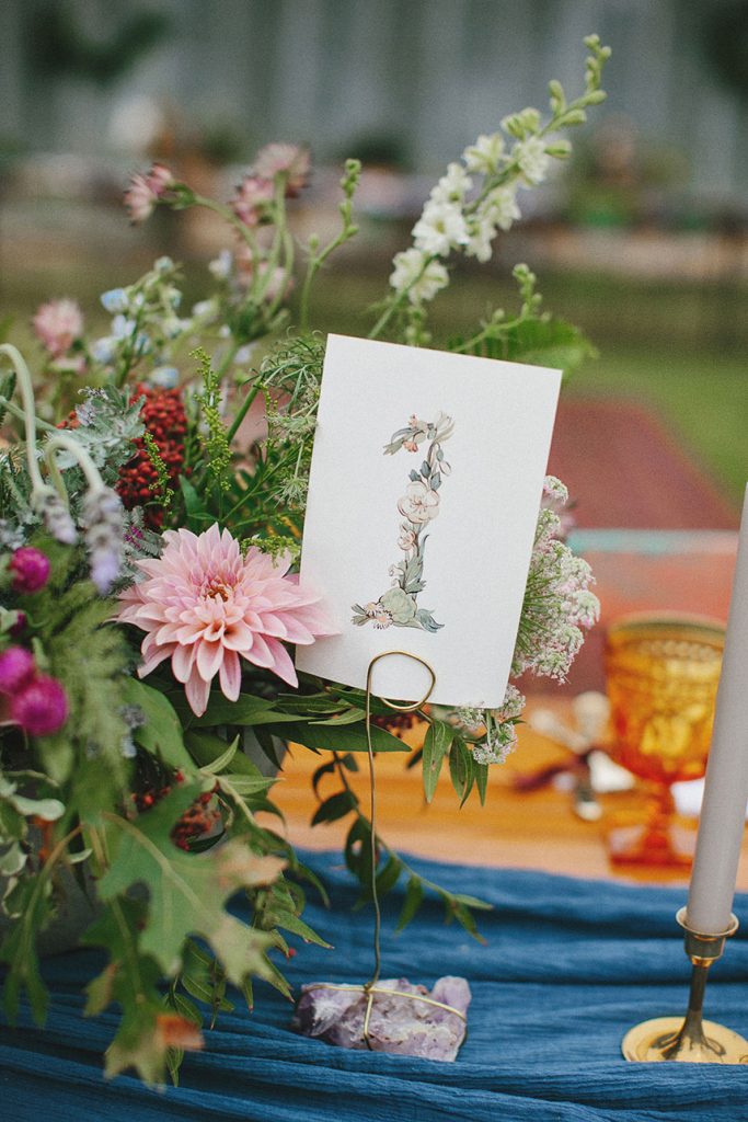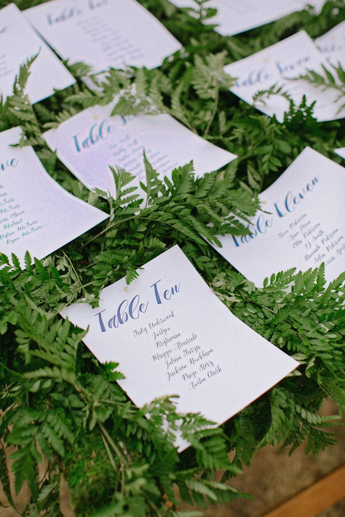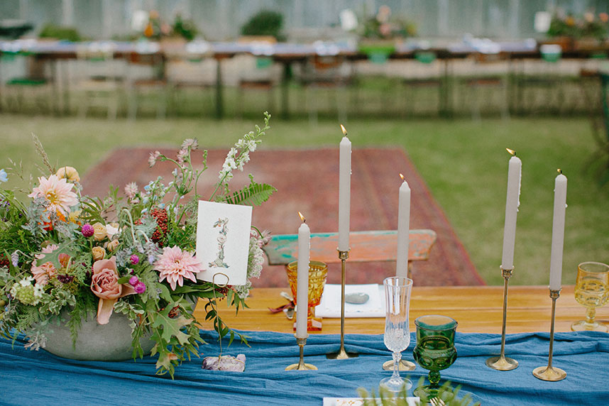 Blue table runners stretched down the tables, topped with colorful glassware and each place setting marked with stones, personalized with every guest’s name in striking calligraphy.