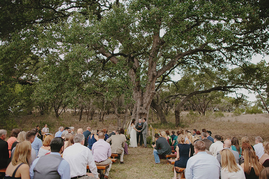 Guests arrived to the outdoor ceremony and were immediately immersed in nature. The greens of the trees met the texture of the grass to form a canopy of color and texture from the start. Wooden benches were set on each side to create an aisle, drawing the eye to the center focal piece of the altar: a huge, expansive oak tree that shot upward and extended outward, creating the perfect backdrop for “I do.”