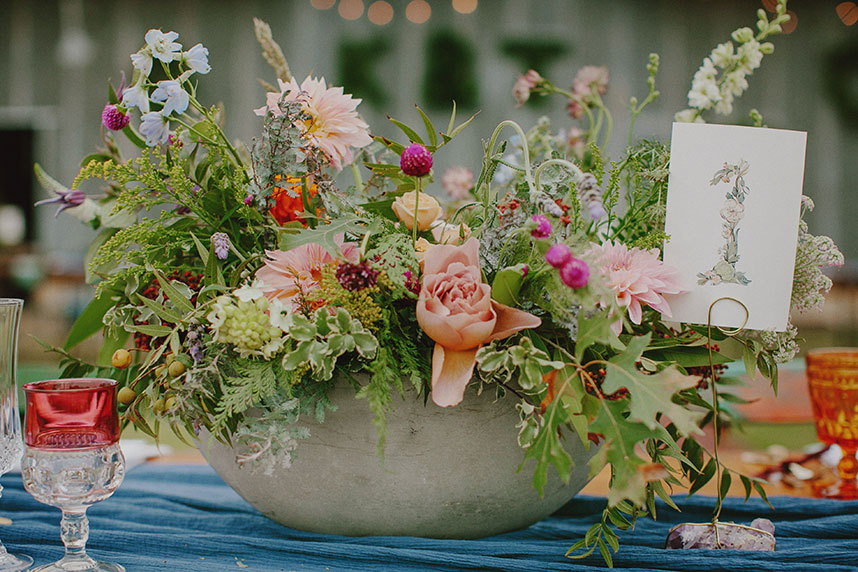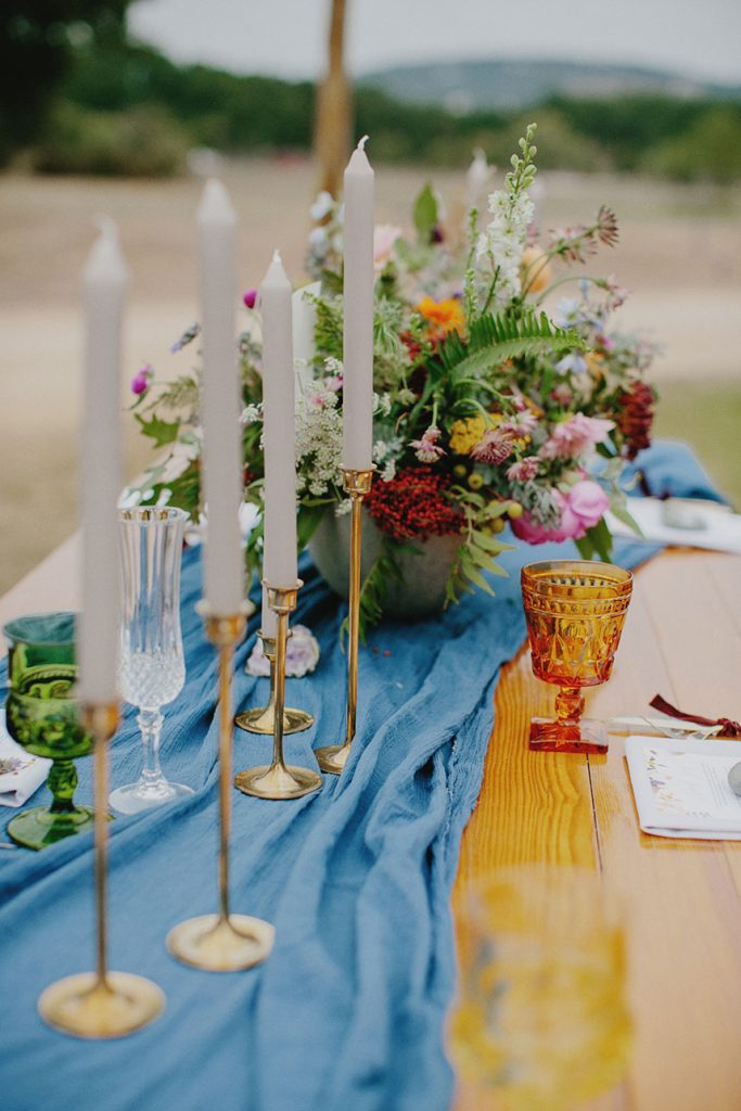 “We really wanted to bring as much of the mountains back to Texas as we could,” says Kelsey. “We thought our color palette should just be based on the mountains—so we pulled in colors from the sunrises and the sunsets into the flowers and used a base of greens, golds, bronzes, and some really deep blues to symbolize the sky.”