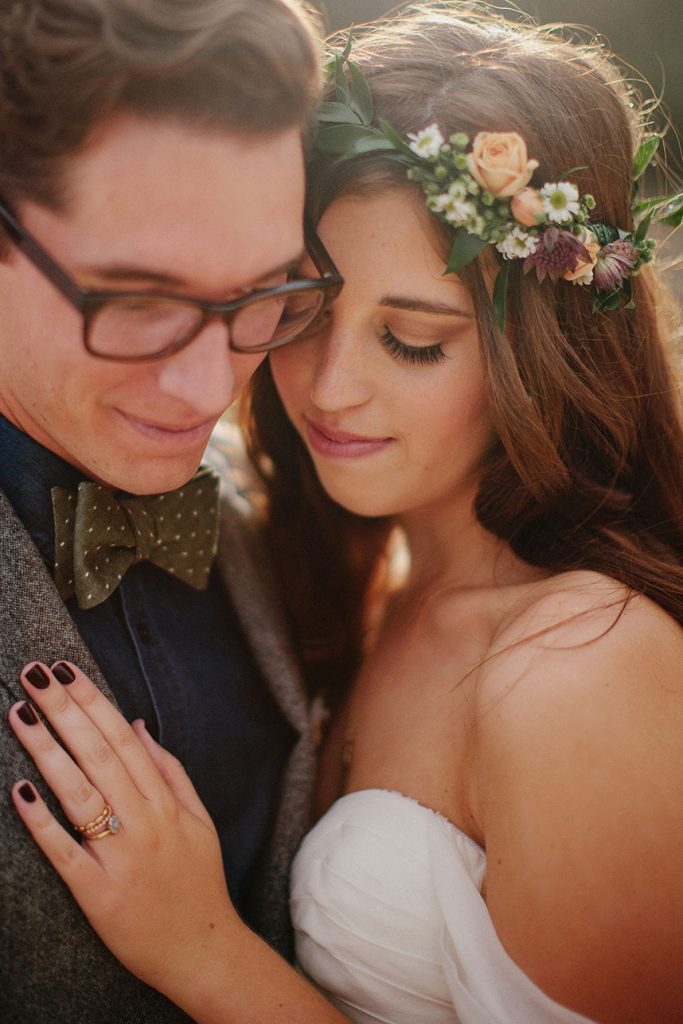 In an off-the-shoulder dress, the bride approached the groom, radiating beauty. A beaded belt hugged her waist, complimenting the dress’s texture as it gently flowed to the ground. Circling her head was a thin, flower crown, bringing greens and soft color to the bride’s look, mirroring the outdoor theme. Beauty at its finest walking toward the one she loved.