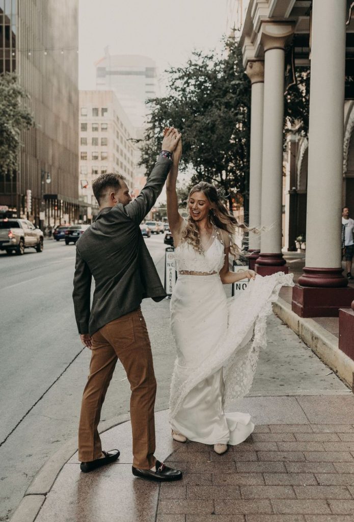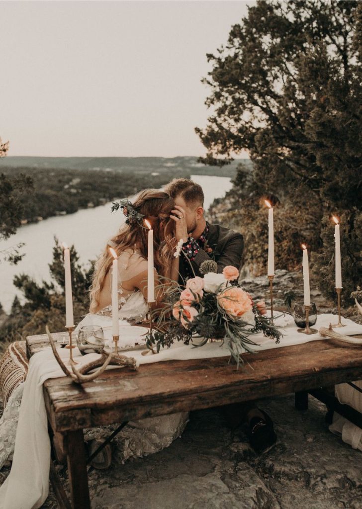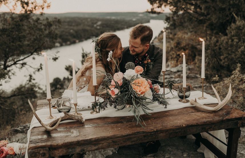 Whether you love ATX for its urban cityscape views or its lakeside natural beauty, this adventurous Austin elopement inspo has it all! Nikk Nguyen wanted to showcase both sides of Austin, so this inspirational styled shoot began at the historic Driskill Hotel, from where the couple sauntered through the downtown streets before heading to a dreamy mountaintop ceremony and intimate dinner at Mount Bonnell on Lake Austin. Wildly Cultivated designed an organic bouquet, gorgeous altar install and statement-making centerpiece all with pink blooms and frothy fronds for a soft, approachable vibe, while Loot Vintage provided the simple metal altar for al-fresco vows. A flower crown, simple jewels and loose, beachy waves play perfectly with the Alexandra Grecco dress from Unbridaled. From an iconic hotel to the best hilltop views in the city, this styled shoot gives us all kinds of ideas for an adventurous Austin elopement – we’re here for it all!