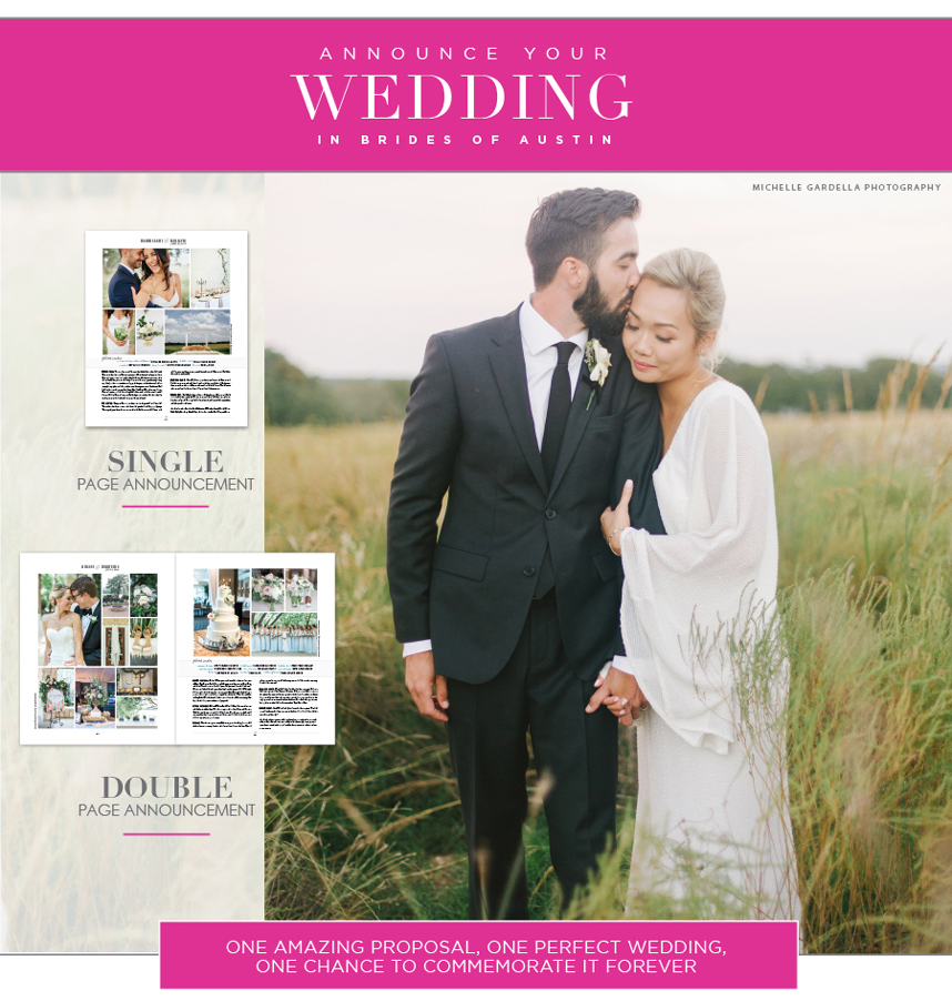 We offer single and double page paid wedding announcement space for couples who desire to announce and commemorate their wedding in Brides of Austin magazine. Single page wedding announcements are $400 and double page wedding announcements are $700. Depending on announcement size, layouts feature between 5-20 pictures and a detailed wedding write-up. Due to space limitations, wedding announcement space must be reserved in advance of our publication deadlines and couples must be approved by our editorial team for coverage. If you’re interested in announcing your wedding in Brides of Austin magazine, simply reserve your spot online here as early as possible to ensure space availability. The deadline for our Fall/Winter 2017 issue is coming up in just two short weeks on July 1st!