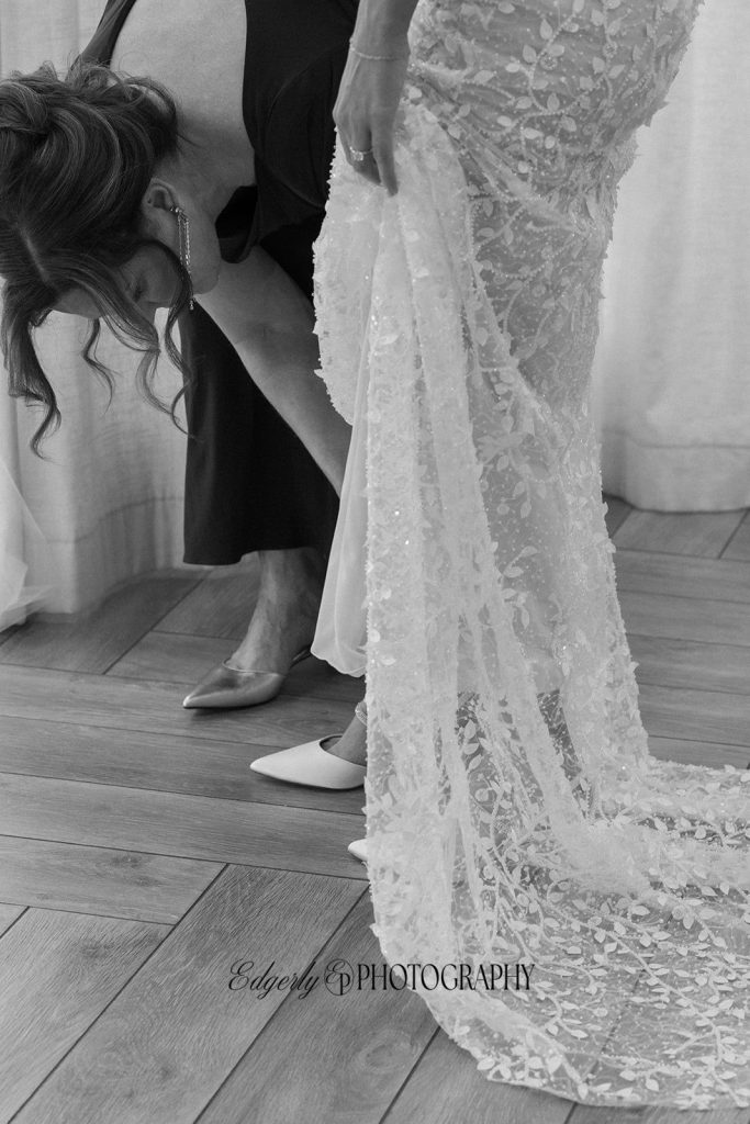 This wedding beautifully blended timeless elegance with personal, heartfelt details. The bride stunned in a lace gown adorned with intricate floral appliqué, while intimate moments—like her final shoe fitting—were tenderly captured. Guests were invited to leave their well wishes through a vintage-inspired audio guestbook, adding a nostalgic yet modern touch. Every detail reflected the couple’s thoughtful style, creating a celebration that was both classic and uniquely their own.