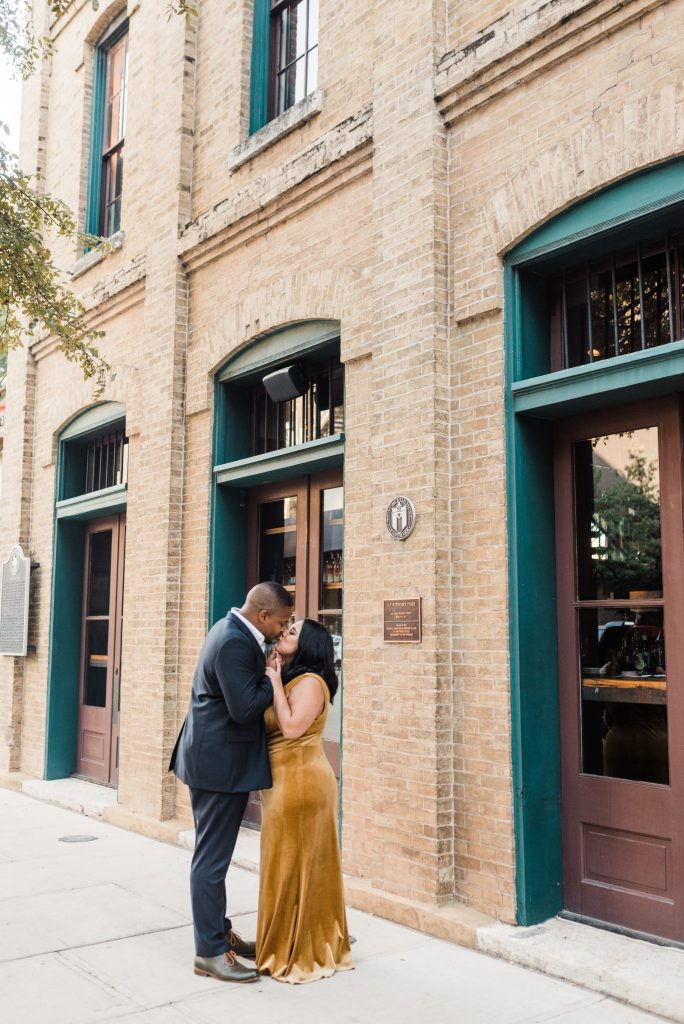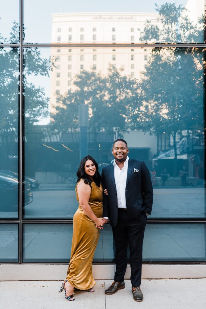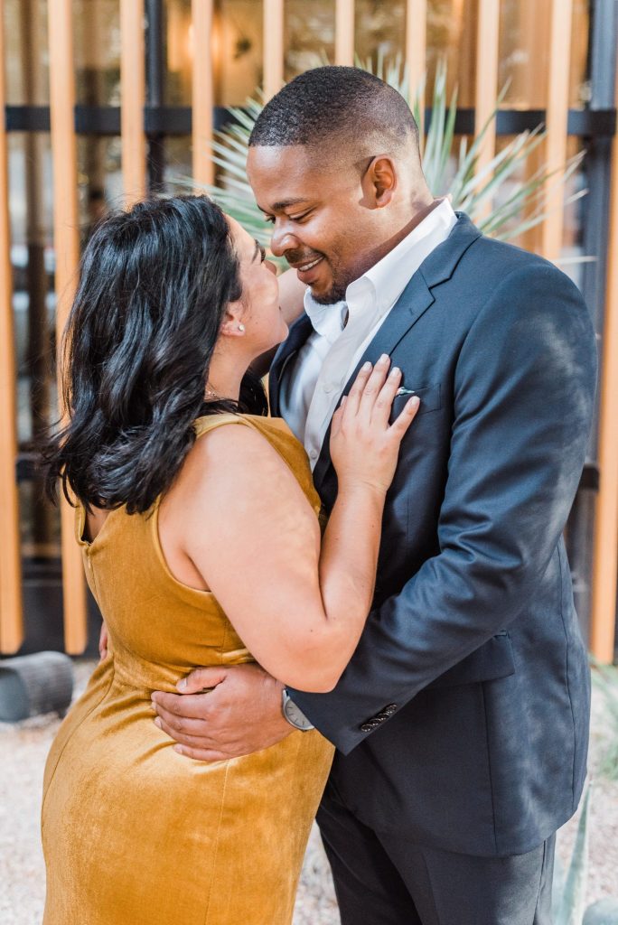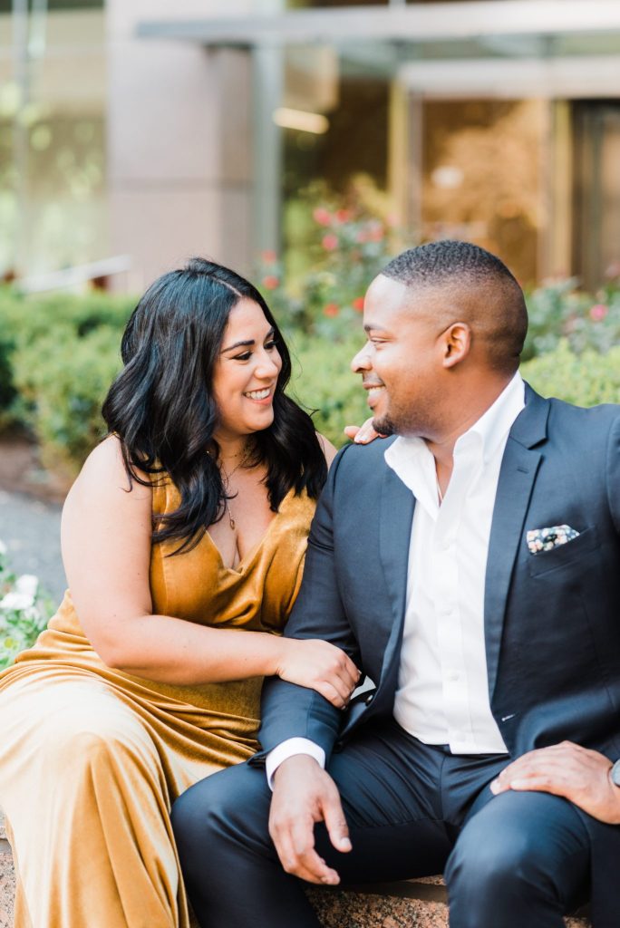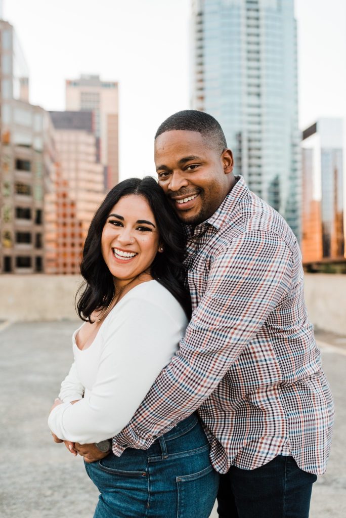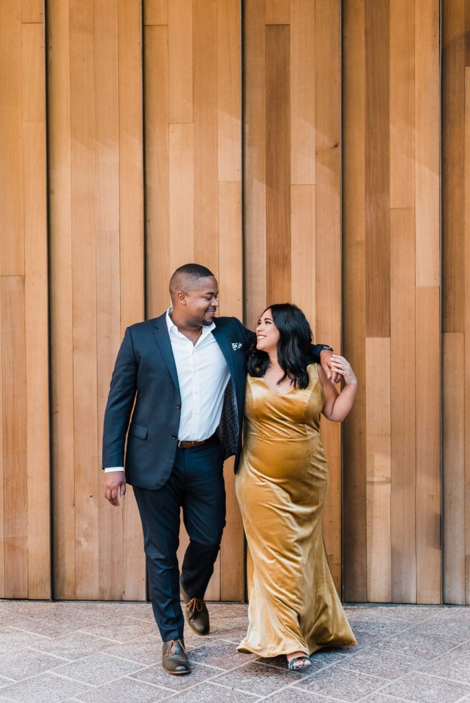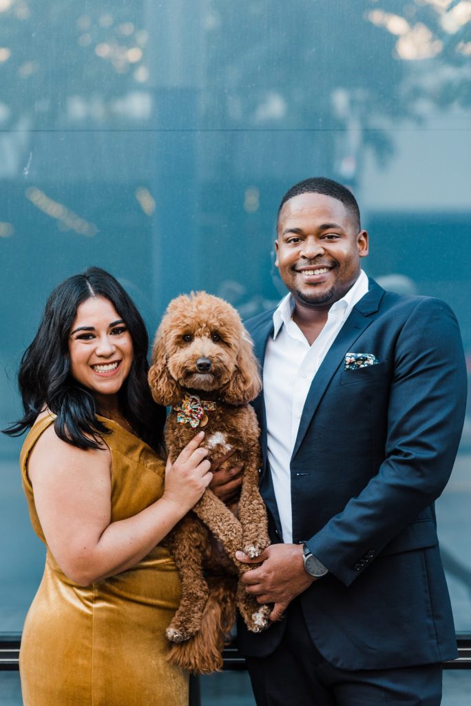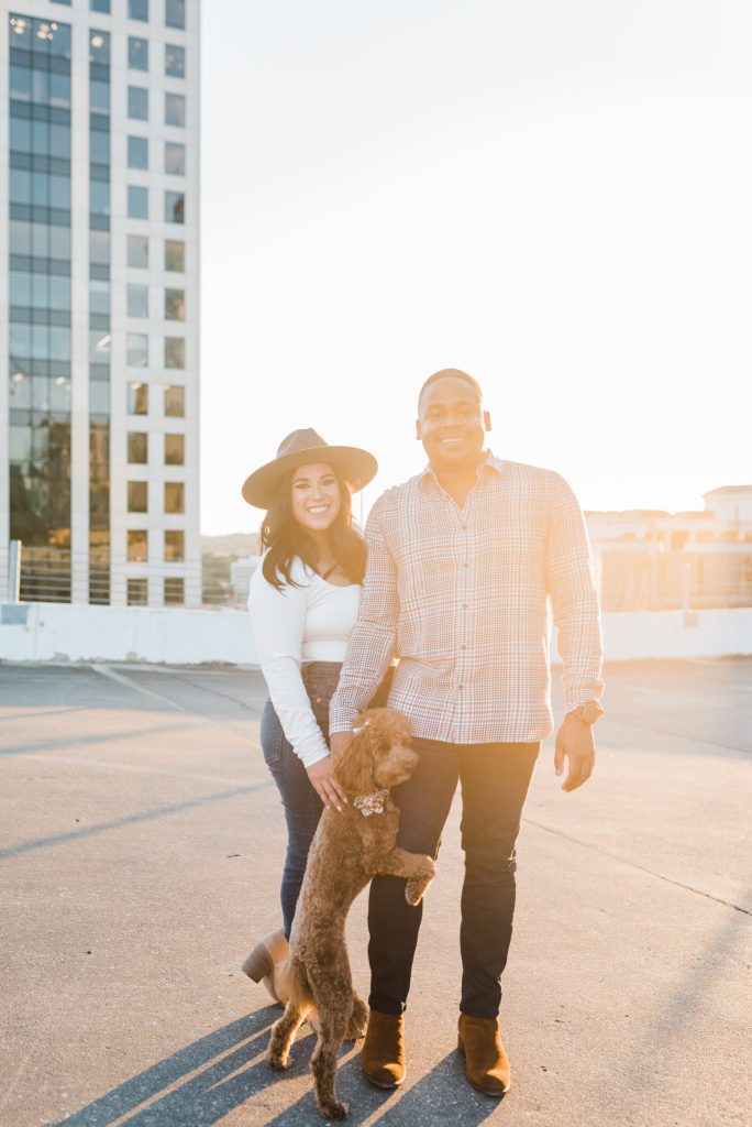 My oh my, do we love the sweet photos Carhart Photography captured of Ashley and Devin in their downtown Austin engagement shoot. This engagement session is full of joy, laughter, so much love, and the couple’s adorable pup– what more could you want! The sweet couple included two outfit changes in their downtown shoot. The first outfit selection contained Ashley wearing a velvet gown and Devin in a suit for some chic and elegant photos. After, the couple slipped into more casual outfits for some golden hour photos with the Austin skyline as their background. Absolutely breathtaking!
