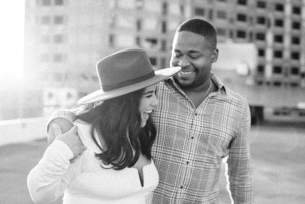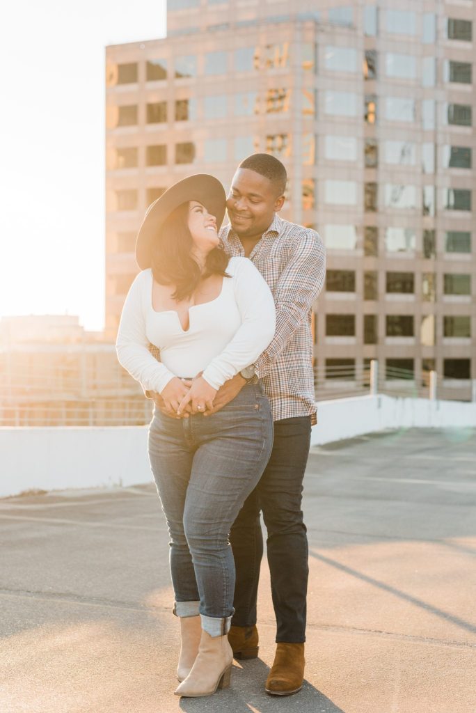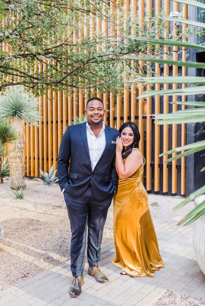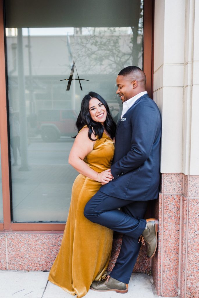 The couple shared they met on Bumble, and after their first date at Whistlers, they knew it was something special! Devin proposed in Breckenridge, Colorado, while on a trip with close family and friends. Ashley knew something was up due to Devin acting suspicious all day. Finally, the couple and their families gathered for family photos at the end of the day. Ashley and Devin were about to take their picture when Devin warned Ashley she had something in her teeth. Knowing Devin was about to get down on one knee, Ashley ran downstairs to fix herself and ran back up. While still trying to catch her breath when she arrived back upstairs, Devin proposed with a dreamy engagement ring! The two are set to wed in April with a White Desert Disco theme wedding. We can’t wait to see what more adorable images Carhart Photography captures of these two this Spring! Until then, we’ll be continuously scrolling through their downtown engagement shoot.