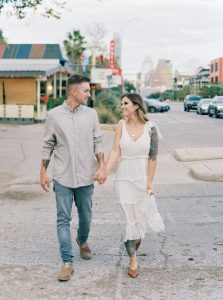 Formal attire and a fun, feathered visitor were just some of the highlights of this Austin engagement session captured by Dreamy Elk Photography & Design, LLC of adorable Rachel and Trevor! The pair first met during their senior year studying at LSU and now recall liking one another but nothing came of it. A few years later, they just happened to be at the same Austin bar on West 6th to cheer on their LSU Tigers. That night, Trevor asked Rachel on a date and since then the two have been simply inseparable! Now they are planning their May 2022 wedding to be held at The Woodbine Mansion where a palette of light blue with pops of spring colors like coral, pink and yellow will help establish their simple and whimsical theme. Décor from Premiere Events will surely set the tone for a luxe mansion affair whether they wed indoors or out. The couple is most excited to have all their favorite people in one place, but also about their signature cocktails named after their two precious dogs: the Ruby Rita and Moscow Max. See their exotic Austin engagement session below that features a few peacock appearances, Rachel and Trevor’s fur babies, and a whole lot of love – plus, read on for the sweetest proposal story of how he popped the question. Cheers to the soon-to-be Reeds!