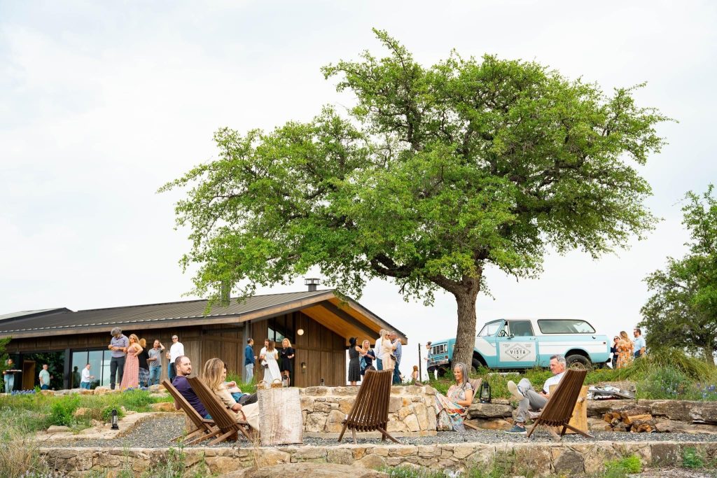 Walden Retreats – Walden Retreats offers an enchanting setting that feels almost too good to be true. Perched high above the Pedernales River, this 96-acre private property boasts a sprawling 5,000-square-foot lawn, perfect for exchanging vows amidst Texas Hill Country’s natural beauty. With private river access, lush live oaks, native grasses, and seasonal wildflowers, the landscape creates a breathtaking backdrop for any celebration. After sunset, guests can gather around the large communal fire pit, surrounded by Tamarack chairs, to make memories under the expansive Texas night sky.