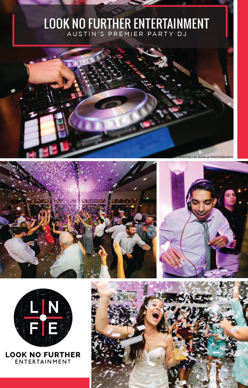 Meet the man behind the music, one of Austin’s premier wedding and event disc jockeys, Ross Phillips with Look No Further Entertainment! Ross founded the company in 2006 and has a deep passion for music and entertaining. With over ten years of experience in and out of nightclubs in the Austin area, your wedding is sure to be poppin’.  The DJs play any genre or generation of music and are extremely talented when it comes to mixing them all together in a seamless blend that keeps your audience dancing all night long! Look No Further works with you, as the bride and groom-to-be, to make a completely customizable playlist from pre-ceremony tunes to grand exit fanfare. Ross and his team certainly know how to read and work a crowd around the dance floor! To contact Ross and the Look No Further pros, call 512.270.9392 or visit online her. Check out some of their music mixes below! Happy Friday!