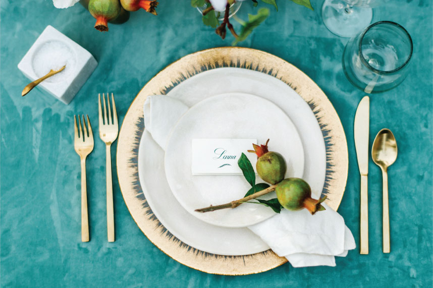 (table, chairs, rug, Fiona sofa, glass vases, ceramic dishware, + brass leaf)