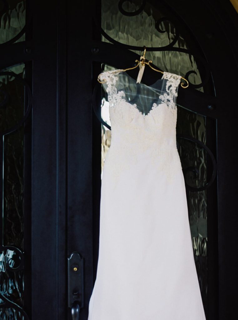 GET HER LOOK: The bride wore an elegant silk faille gown designed by Liancarlo. The classic silhouette was fashioned with a high illusion neckline and French Alencon lace. Covered buttons adorned the low-V back of the gown, dramatically accenting her fluted skirt.