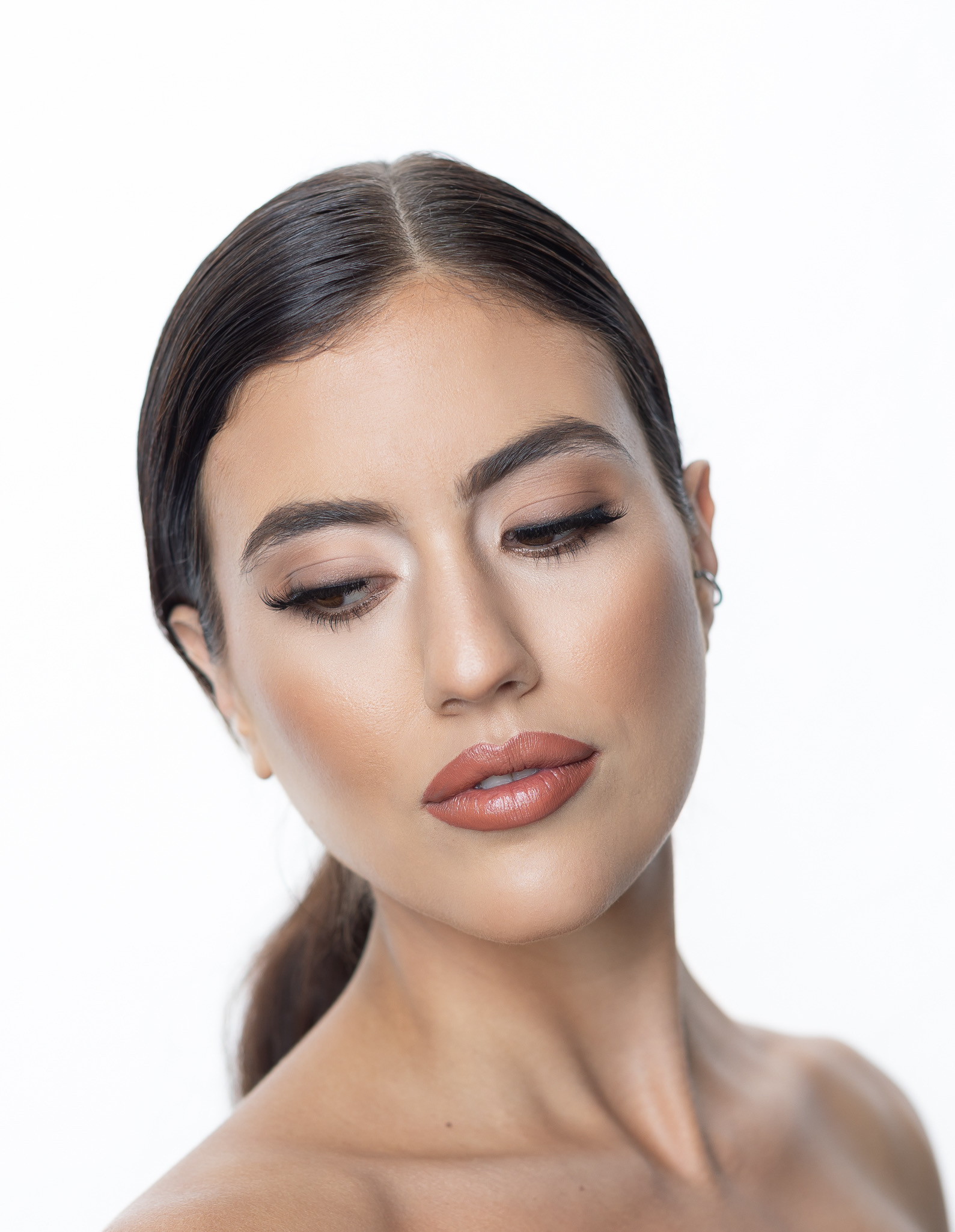 “This is one of my favorite looks for fall, but it could totally be worn for any season! I really wanted to showcase a timeless bridal look using a terracotta color palette as my inspiration. For the eyes, I used the Makeup By Mario Master Mattes Eyeshadow Palette. I used a combination of sienna and brown tones and really blew them out for a soft look that still defined the eyes. I completely avoided using any eyeliner here and simply smoked out the lash line using a deep brown shadow. To achieve an overall healthy, bronze glow, I applied the Saie Sun Melt Cream-Balm Bronzer in Medium Bronze to the cheeks, forehead and jawline. For the lips, I lined them with a MAC Lip Pencil in Spice and filled them in with a satin shade that I formulated by mixing a brown-nude and a pink-orange shade. This is such a versatile look that would be flattering on anyone!”