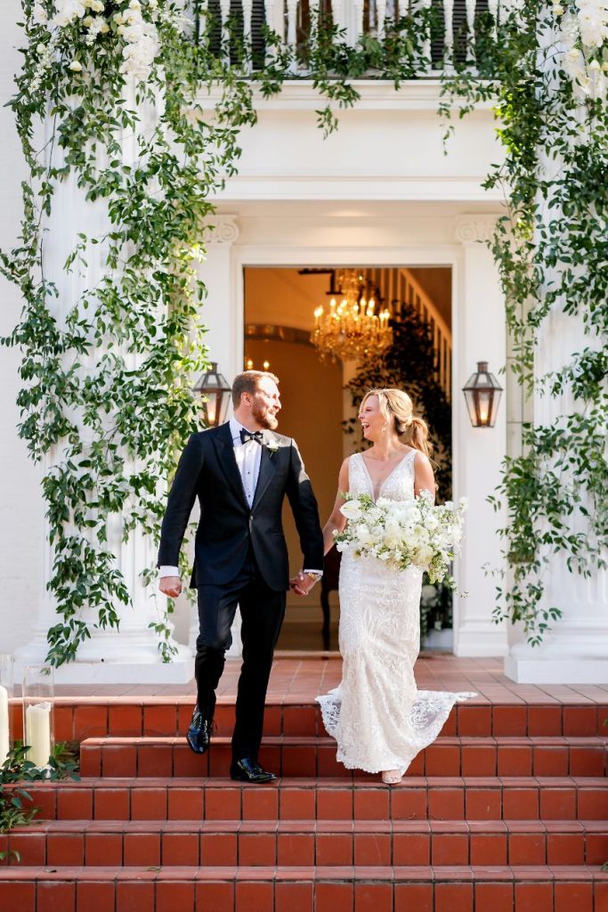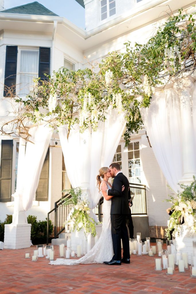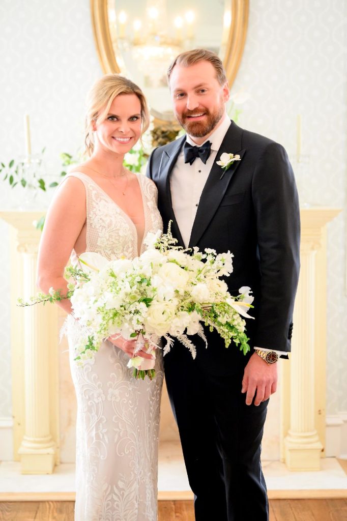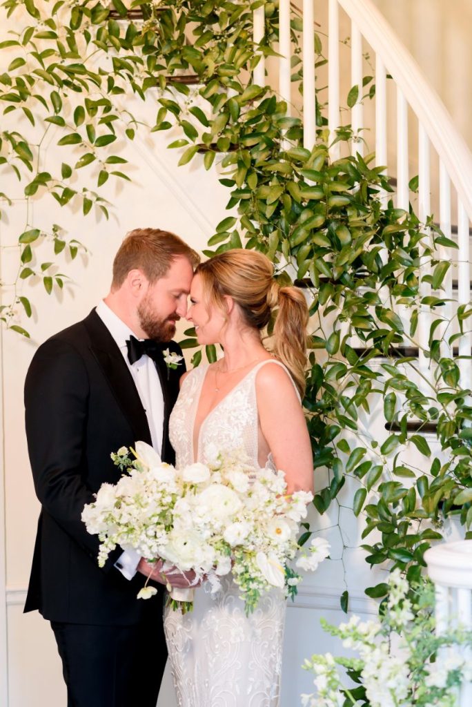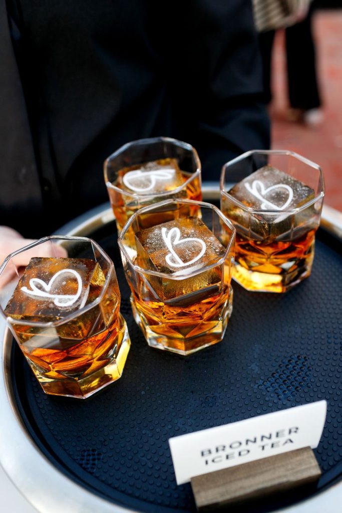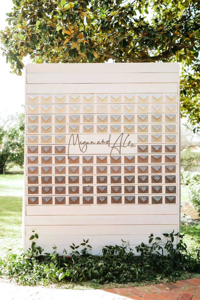 There’s nothing classier than a black-tie affair, and this garden party wedding took place right in the backyard of The Woodbine Mansion underneath a dreamy, string-lit tent. Wedding planner of seven years, Megan, and her husband Alex put together their nontraditional nuptials with the help of Pearl Events Austin to be the magical, tented event of their dreams and they included so many unique details! Megan and Alex got ready together on their big day, and even got pre-wedding massages from Live Love Relax to make the day even more relaxing and smooth. As guests came in, they picked up a program from a wall at the entrance that had envelopes holding the plan for the night and hand-written personal notes as well. Plentiful greenery and white blooms from Bouquets of Austin adorn nearly every wedding scene but we can’t take our eyes off the suspended floral installation hanging over the outdoor dance floor. Guests enjoyed a delicious reception dinner, signature cocktails and bartending by Crave Catering with some subtle custom details floating around. Personalized ice cubes from Full Spectrum Ice Sculptures add a fun touch to drinks of all kinds! To add even more flair to their dance floor, Megan and Alex made a “wig bar” where guests could choose from various colorful hairdos to grab and get to dancing. From the luxe, modern décor from Premiere Events, Table Manners and others to the fun party atmosphere, this garden party wedding was certainly a night to remember. Read on for a note from the bride about one of her favorite details to include in their wedding day. Cheers to the Bronners!