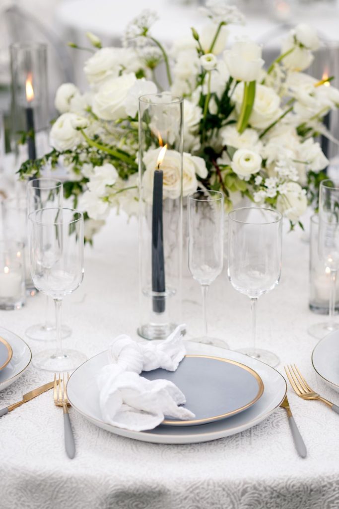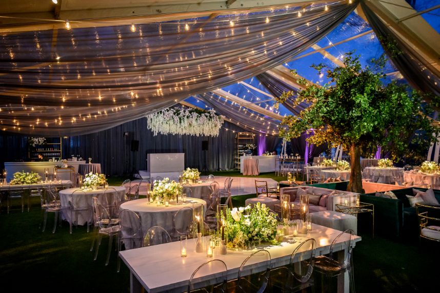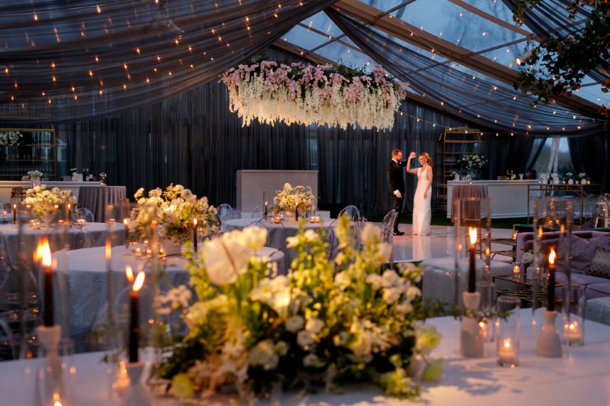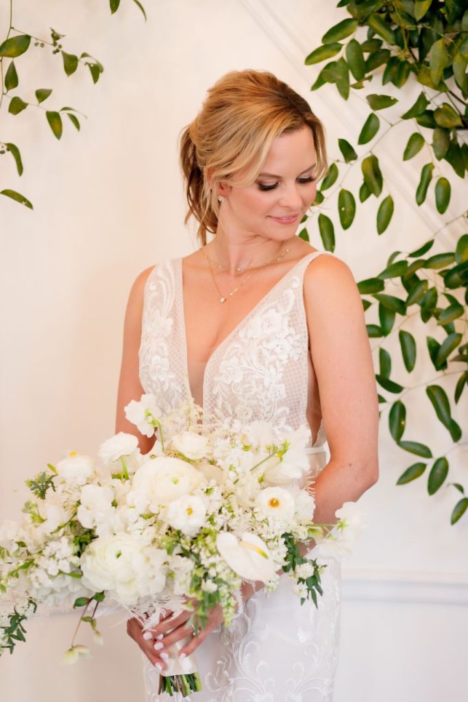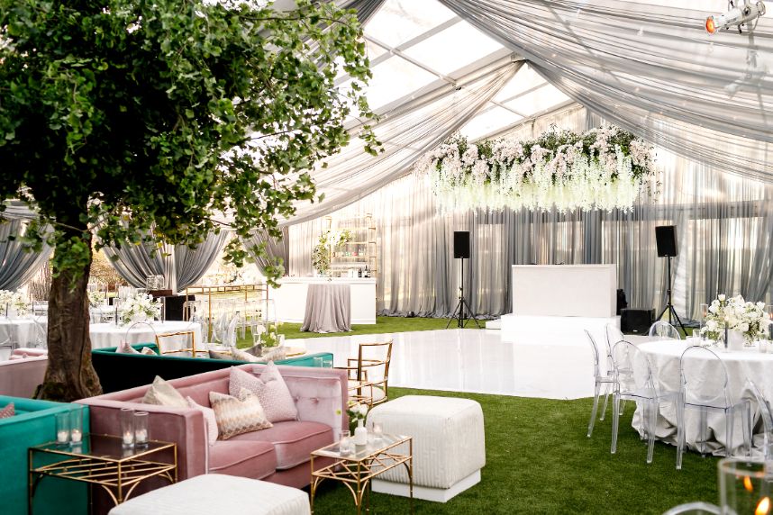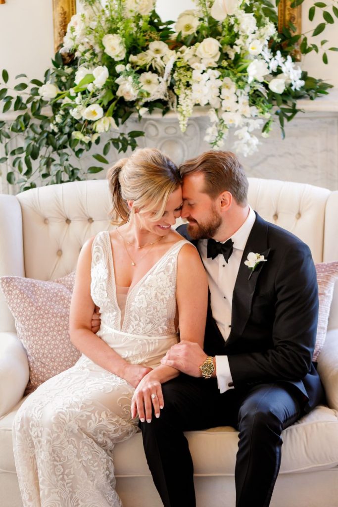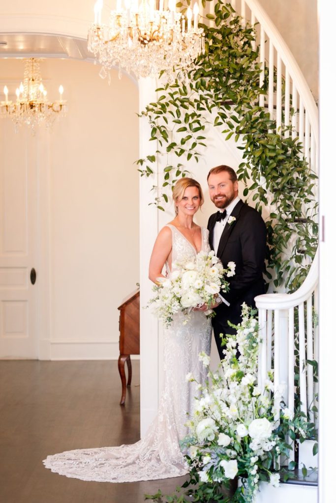 There’s nothing classier than a black-tie affair, and this garden party wedding took place right in the backyard of The Woodbine Mansion underneath a dreamy, string-lit tent. Wedding planner of seven years, Megan, and her husband Alex put together their nontraditional nuptials with the help of Pearl Events Austin to be the magical, tented event of their dreams and they included so many unique details! Megan and Alex got ready together on their big day, and even got pre-wedding massages from Live Love Relax to make the day even more relaxing and smooth. As guests came in, they picked up a program from a wall at the entrance that had envelopes holding the plan for the night and hand-written personal notes as well. Plentiful greenery and white blooms from Bouquets of Austin adorn nearly every wedding scene but we can’t take our eyes off the suspended floral installation hanging over the outdoor dance floor. Guests enjoyed a delicious reception dinner, signature cocktails and bartending by Crave Catering with some subtle custom details floating around. Personalized ice cubes from Full Spectrum Ice Sculptures add a fun touch to drinks of all kinds! To add even more flair to their dance floor, Megan and Alex made a “wig bar” where guests could choose from various colorful hairdos to grab and get to dancing. From the luxe, modern décor from Premiere Events, Table Manners and others to the fun party atmosphere, this garden party wedding was certainly a night to remember. Read on for a note from the bride about one of her favorite details to include in their wedding day. Cheers to the Bronners!