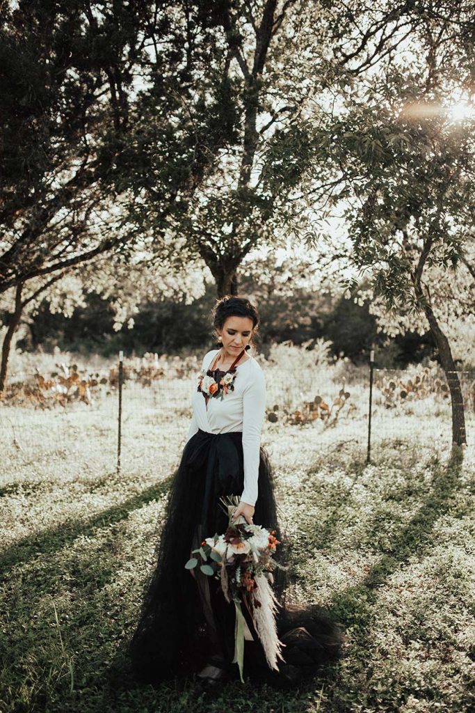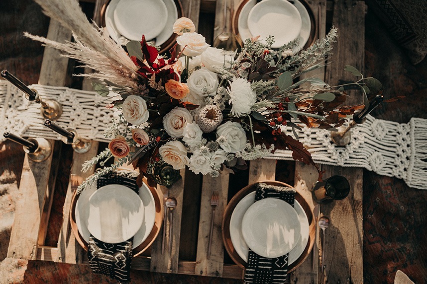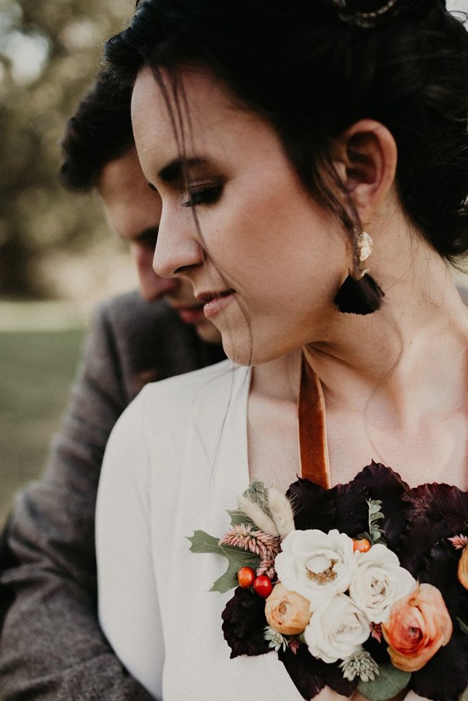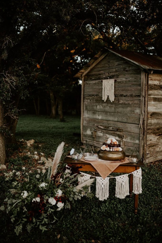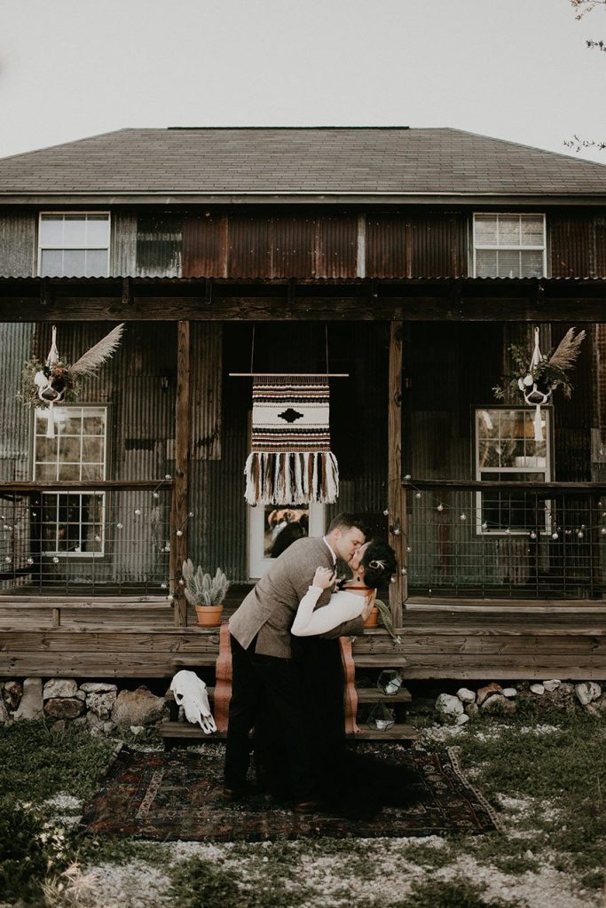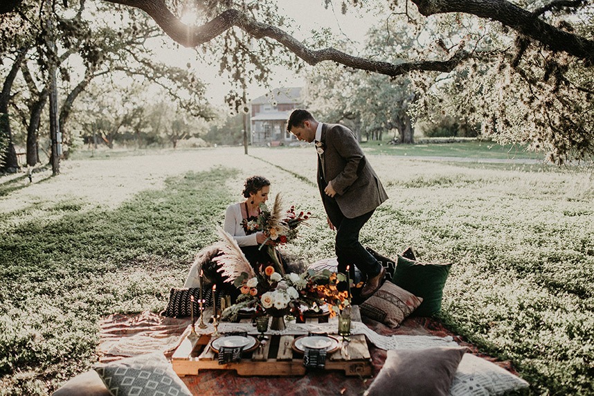 When Austin’s wedding vendors collaborate on a concept filled with equal parts romance and free-spirited ease, the result is nothing short of swoon-worthy as exhibited in these images chock-full of bohemian farm wedding inspiration. Rich and moody lighting lent a vintage touch to the images, perfectly ideal for the quaint, private little barn backdrop. Decor was kept simple and sweet, fully embodying the boho spirit through a mix of textures and patterns in desert-like, earthy hues. The ultimate nod to bohemia, macrame pieces in the form of table runners and fringed banners served as eye-catching, carefully placed decor. A plush picnic-style celebratory table setting served as an appropriately low-key spot for a post-ceremony bite, using wood crates atop Moroccan-like rugs for a table. Loot Vintage Rentals provided pillows in mixed patters and both soft and bold Southwestern-like colors. The tabletop was set with wood and white plates, black and white printed linens, copper flatware and dark candles and glasses to add a bit of moody romance to the setting. Delightfully overgrown floral arrangements of a wide variety of blooms from Wildly Cultivated Florals perfectly anchored the table center and accompanied the model bride throughout the shoot. Mixing in earthy elements of greenery, berries and wheatgrass-like stalks, soft peachy-pink and blush-hued roses and ivory carnations kept each arrangement soft and sweet. From the easy, desert decor to the romantic florals, we’ll be obsessing over this boho dream for months to come! Enjoy!