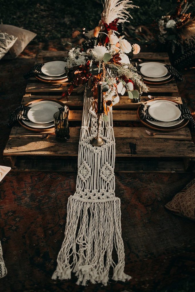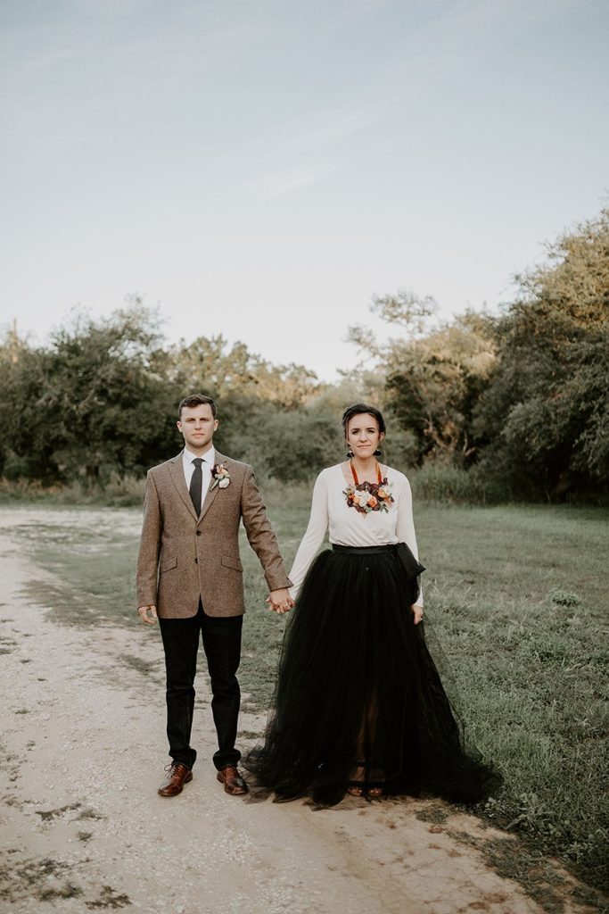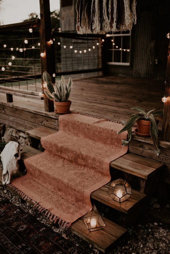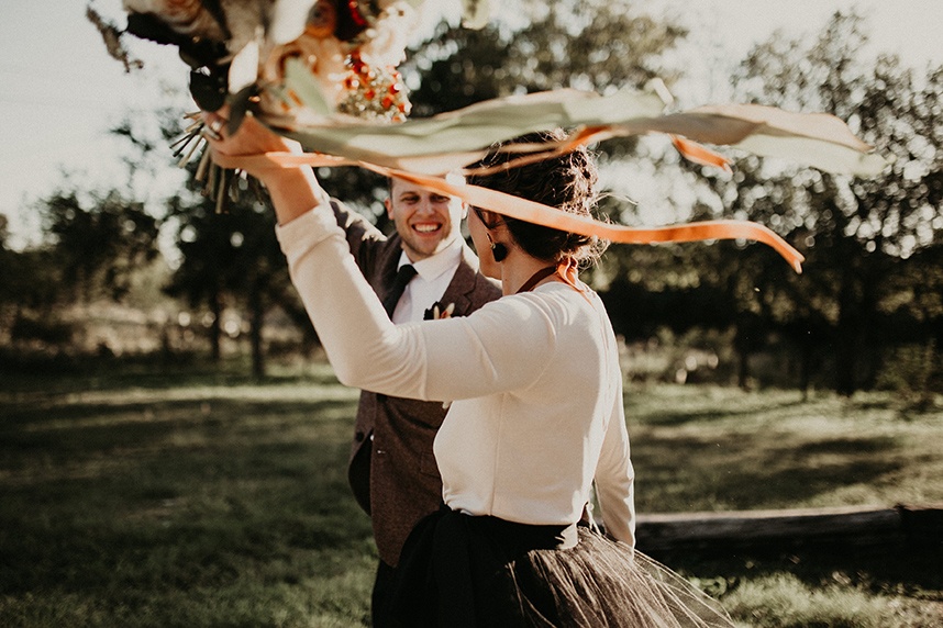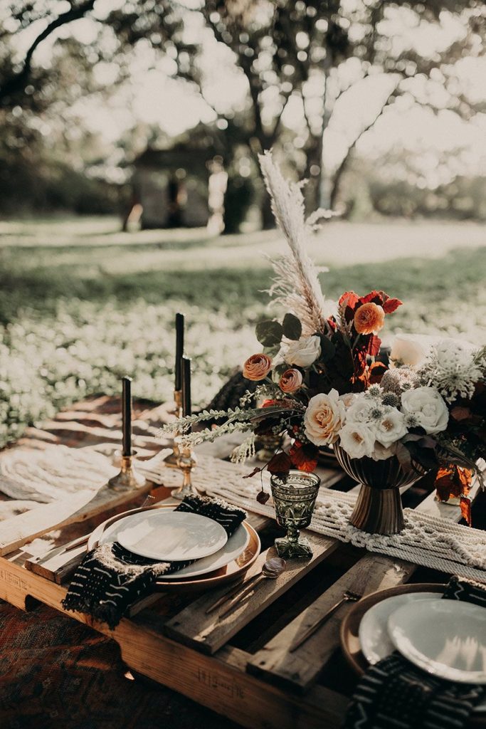 When Austin’s wedding vendors collaborate on a concept filled with equal parts romance and free-spirited ease, the result is nothing short of swoon-worthy as exhibited in these images chock-full of bohemian farm wedding inspiration. Rich and moody lighting lent a vintage touch to the images, perfectly ideal for the quaint, private little barn backdrop. Decor was kept simple and sweet, fully embodying the boho spirit through a mix of textures and patterns in desert-like, earthy hues. The ultimate nod to bohemia, macrame pieces in the form of table runners and fringed banners served as eye-catching, carefully placed decor. A plush picnic-style celebratory table setting served as an appropriately low-key spot for a post-ceremony bite, using wood crates atop Moroccan-like rugs for a table. Loot Vintage Rentals provided pillows in mixed patters and both soft and bold Southwestern-like colors. The tabletop was set with wood and white plates, black and white printed linens, copper flatware and dark candles and glasses to add a bit of moody romance to the setting. Delightfully overgrown floral arrangements of a wide variety of blooms from Wildly Cultivated Florals perfectly anchored the table center and accompanied the model bride throughout the shoot. Mixing in earthy elements of greenery, berries and wheatgrass-like stalks, soft peachy-pink and blush-hued roses and ivory carnations kept each arrangement soft and sweet. From the easy, desert decor to the romantic florals, we’ll be obsessing over this boho dream for months to come! Enjoy!