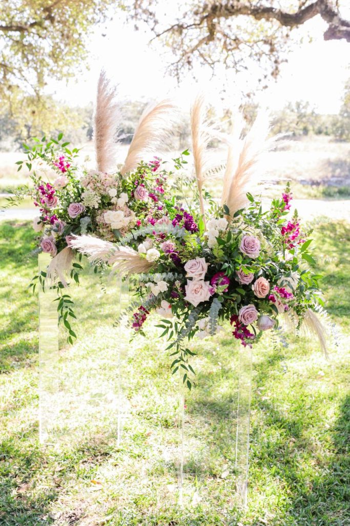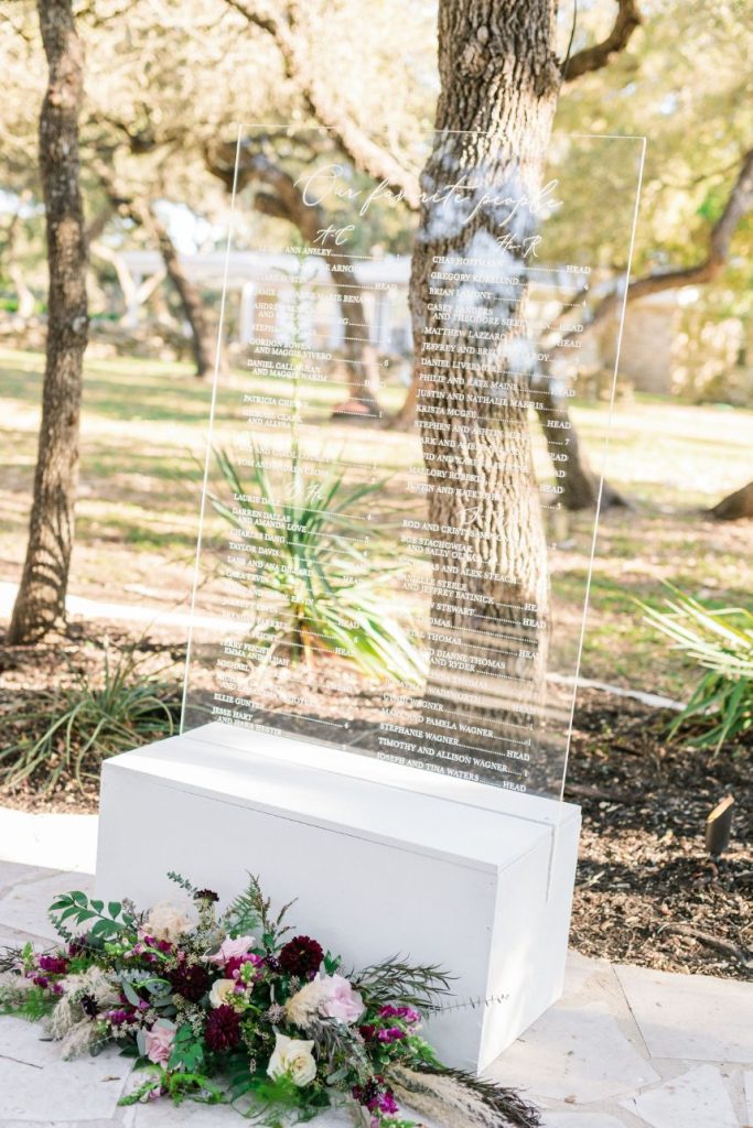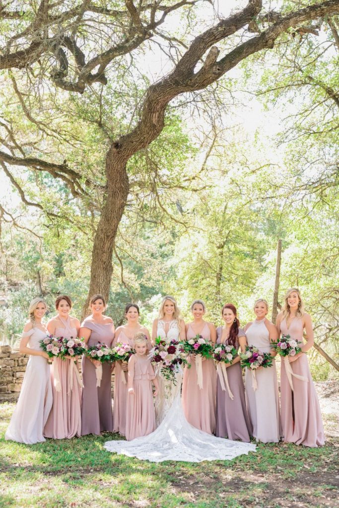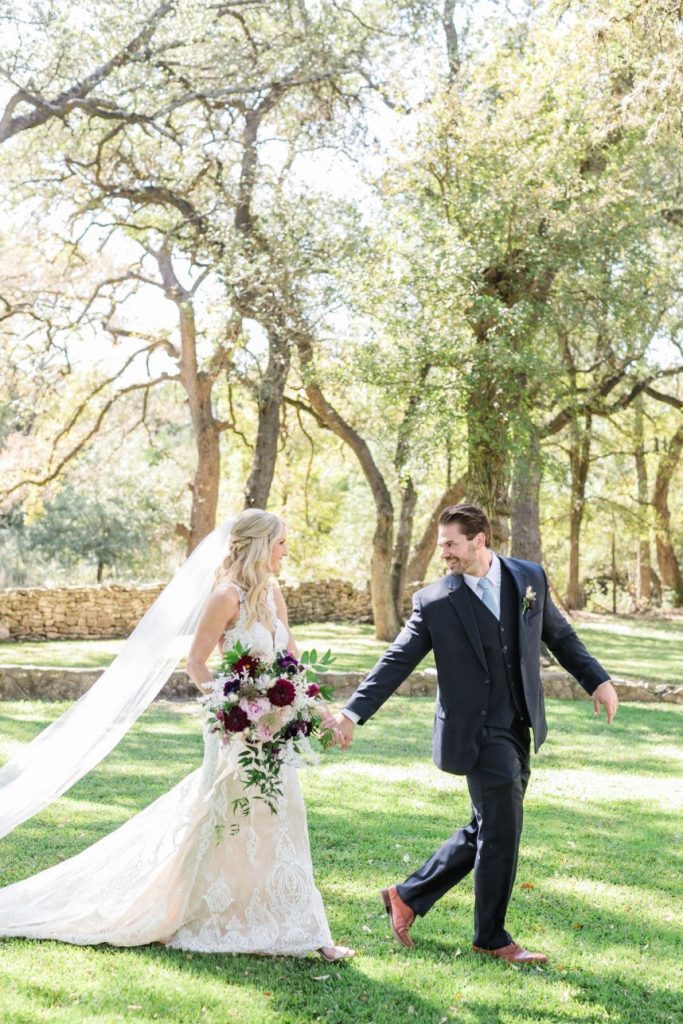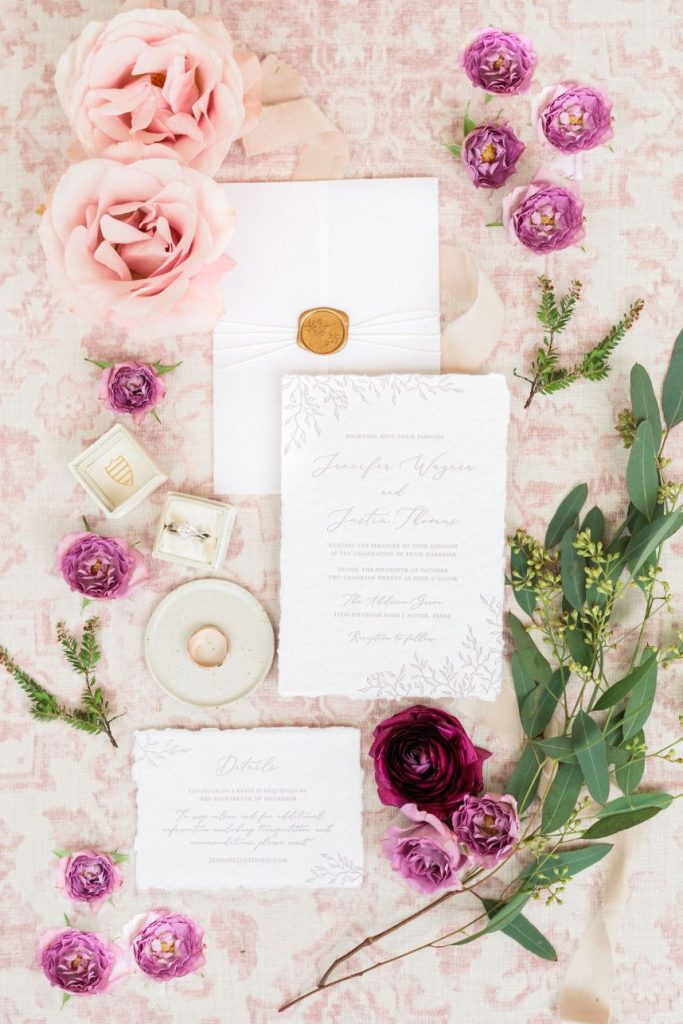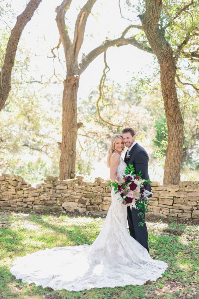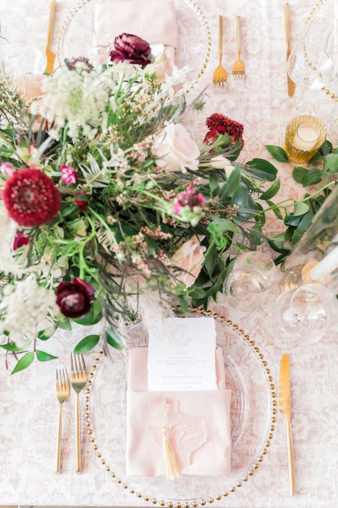 This boho chic outdoor wedding at The Addison Grove had the most romantic color palette in shades of ruby! Before the big day even arrived, the wedding party enjoyed an amazing rehearsal dinner, thanks to some scrumptious cuisine from Salt Lick BBQ. Delicate florals in whipped apricot, woodrose and fig hues along with a few pampas grass additions from Bouquets of Austin adorned the beautiful outdoor altar at The Addison Grove and set the stage for romantic and chic tablescapes at their indoor reception. Premiere Events‘ clear glass charger with a beaded gold rim, gold flatware and pale blush linens made for simple yet modern place settings that we are truly captivated by. Not only were the details of this day simply perfect, Jennifer herself was flawless in her gorgeous bridal gown from Brickhouse Bridal. All of the romantic, ruby details of this celebration were expertly curated by the expert planners of Pearl Events Austin, who ended up being Jennifer’s favorite wedding vendor from her day. And we can’t forget about those mini chicken and waffle bites from Royal Fig Catering – there’s not a better cocktail hour snack in our opinion! You do not want to miss their wedding gallery, or the bride’s one piece of advise for future brides, all featured below. Cheers to Mr. and Mrs. Thomas!