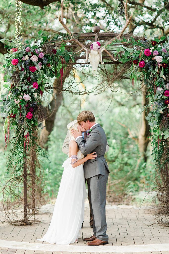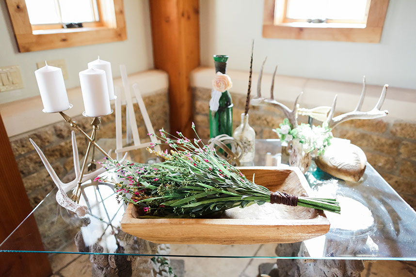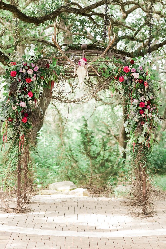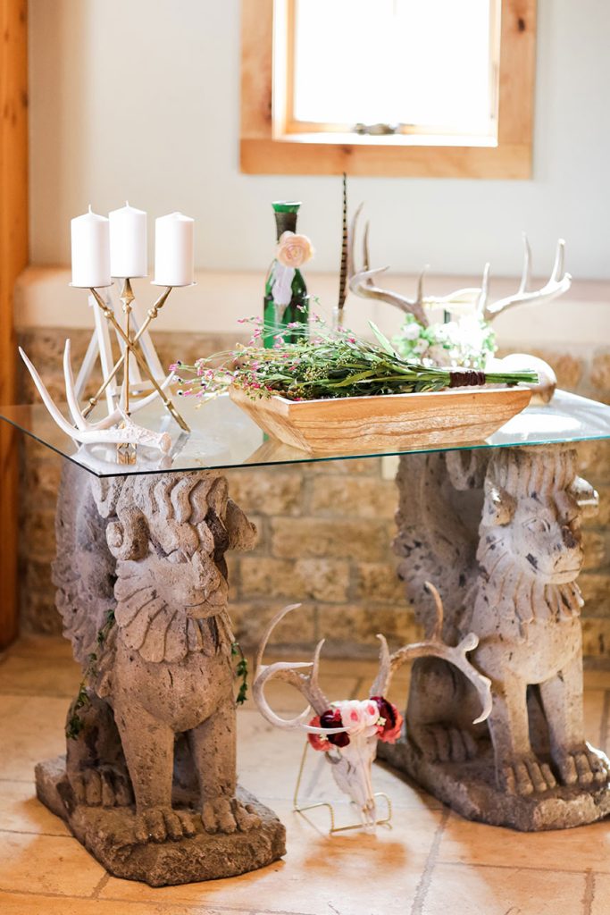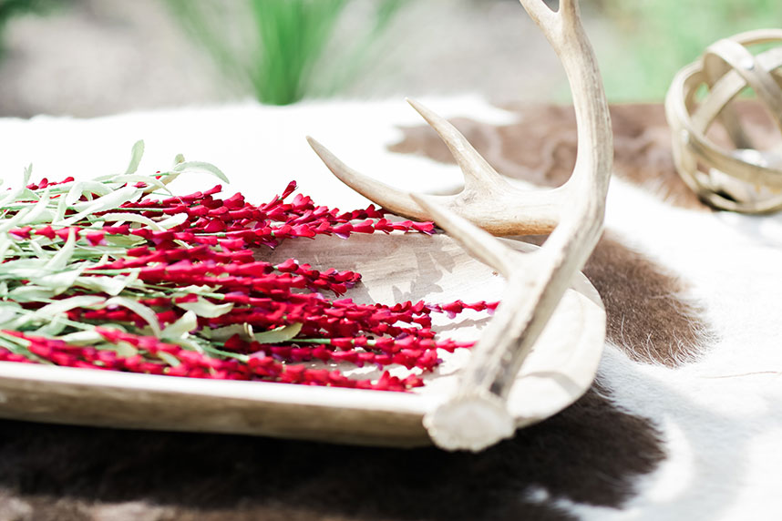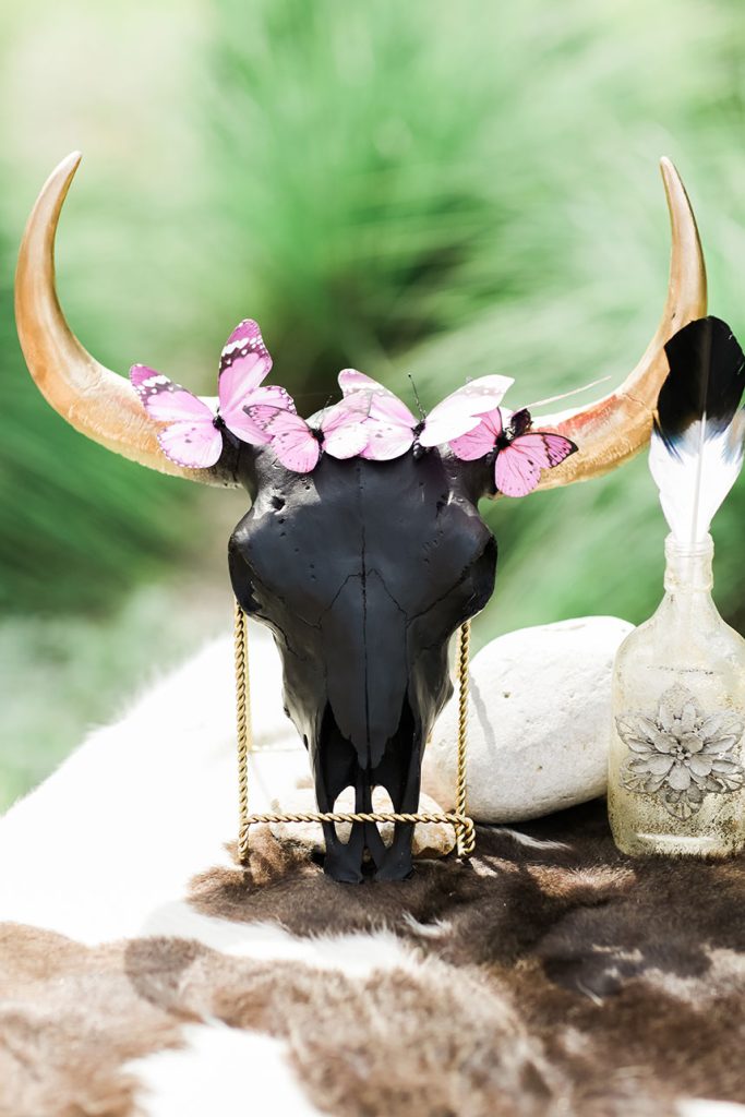 SPECIAL TOUCHES: Some of the bohemian chic design pieces included a beautiful setting at the altar. Blaze chose to have an elk skull with antlers adorned with wild, flowing greenery and bold floral accents mounted at the top of the altar. Davy Gray created a lush floral headdress to top off the entire scene. At the reception, the bohemian feel continued with branch teepee centerpieces, metallic paint-splattered table runners, copper-tipped antlers and glitter-dipped feathers.