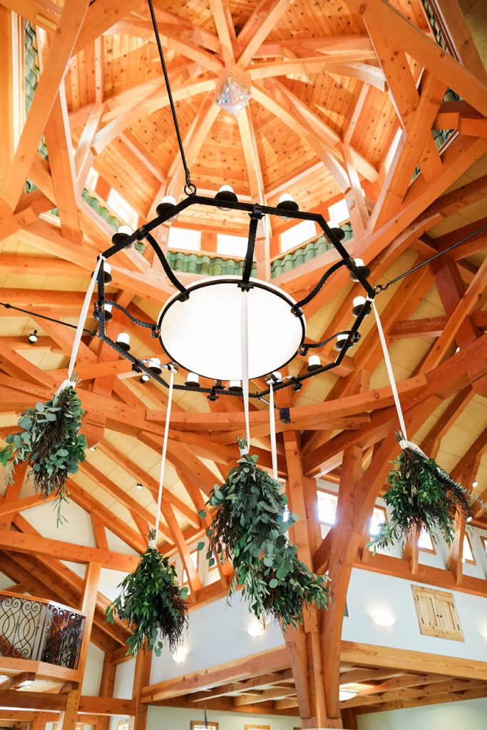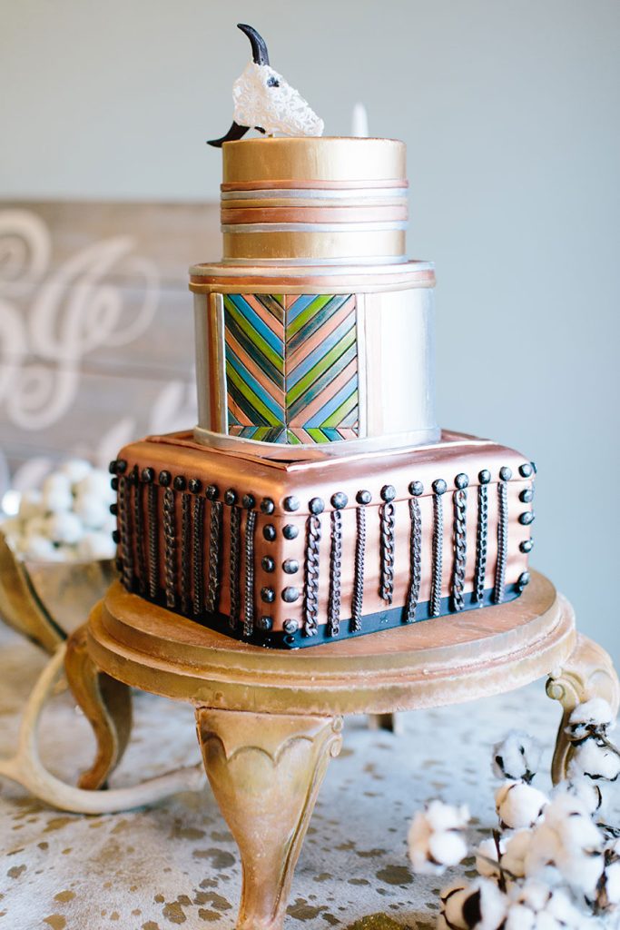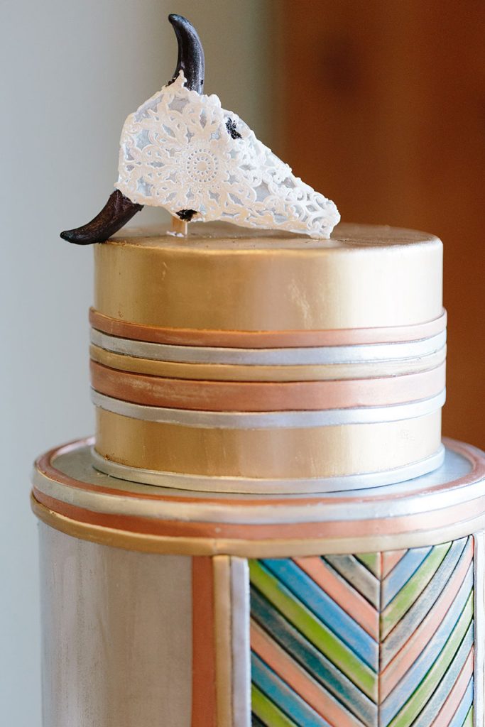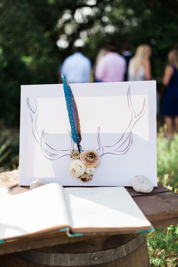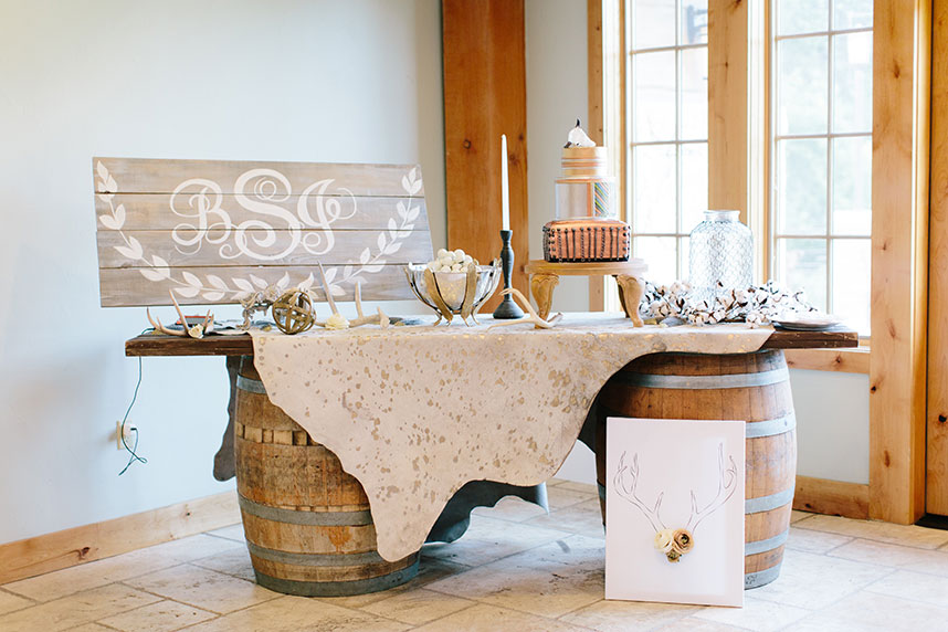 SPECIAL TOUCHES: Some of the bohemian chic design pieces included a beautiful setting at the altar. Blaze chose to have an elk skull with antlers adorned with wild, flowing greenery and bold floral accents mounted at the top of the altar. Davy Gray created a lush floral headdress to top off the entire scene. At the reception, the bohemian feel continued with branch teepee centerpieces, metallic paint-splattered table runners, copper-tipped antlers and glitter-dipped feathers.