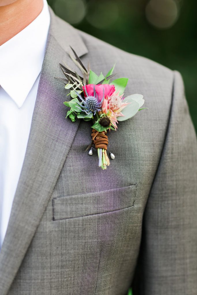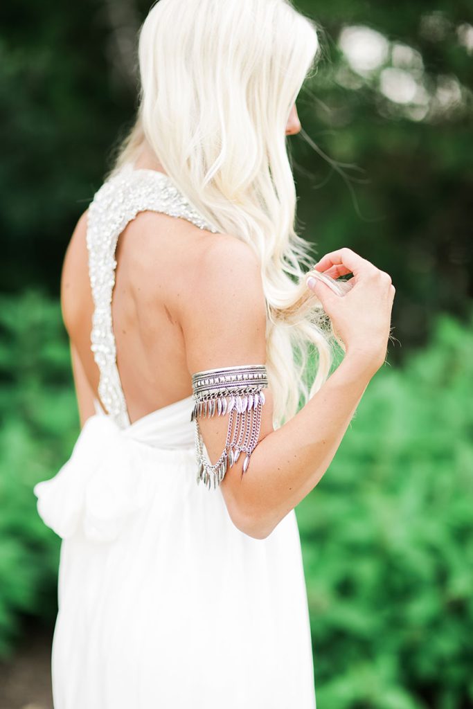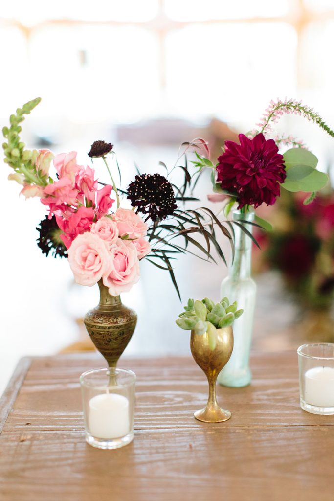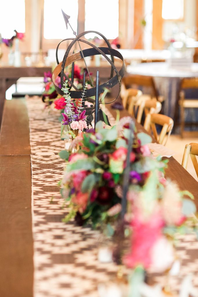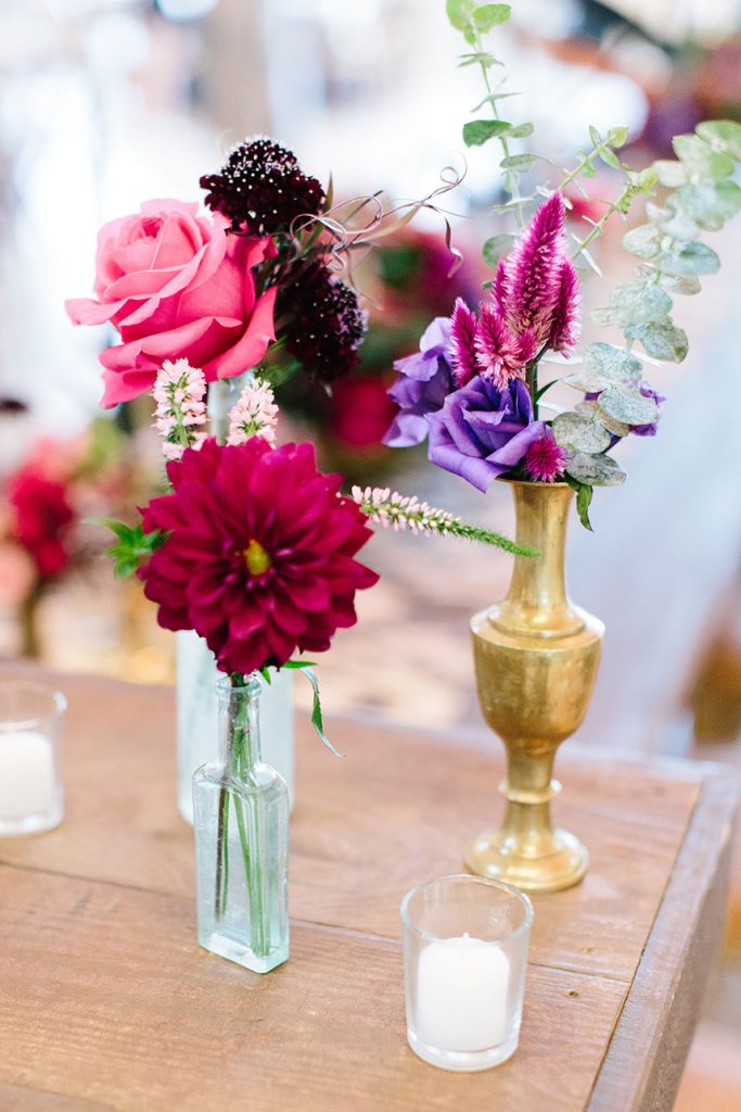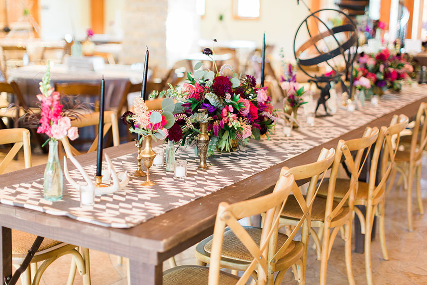 HUES SHE USED: Blaze wanted to implement things that are not usually seen at a traditional wedding. She was inspired by the bohemian-chic style, and loved the idea of a neutral base with pops of glam and color. Blaze chose to use neutral metallic colors with hints of deep green, fuchsia and rose.