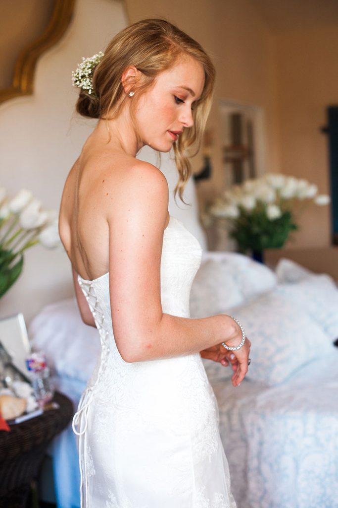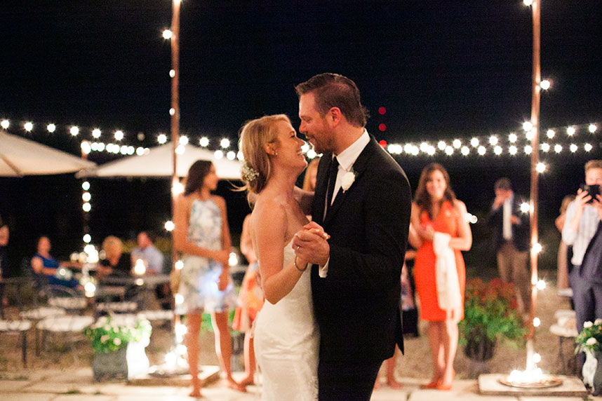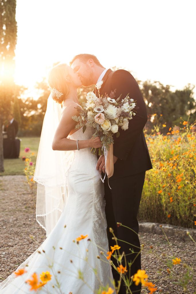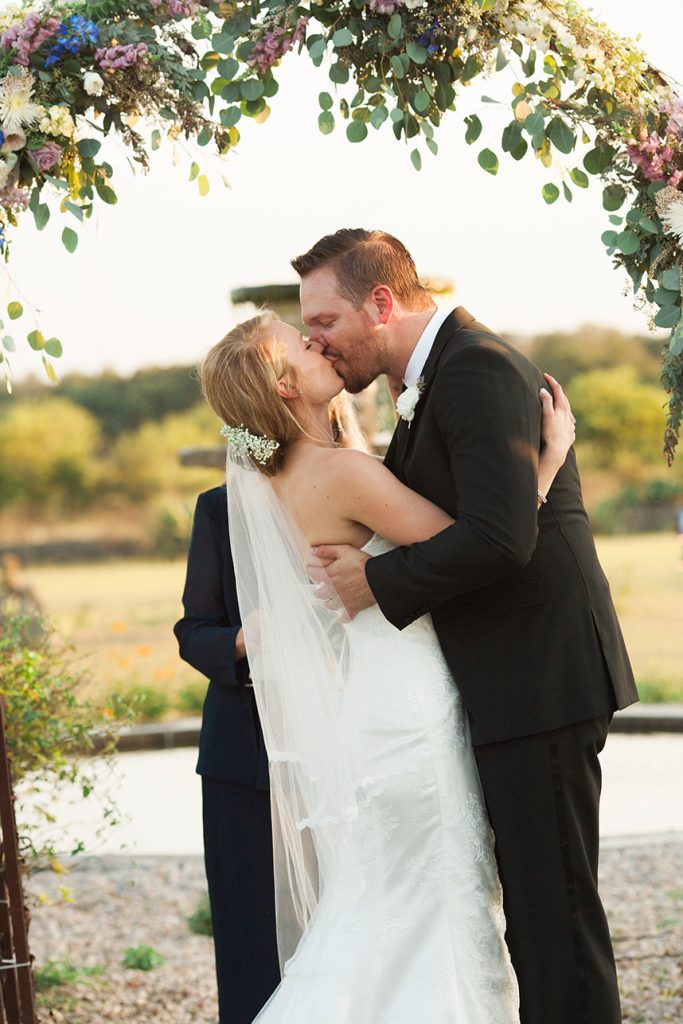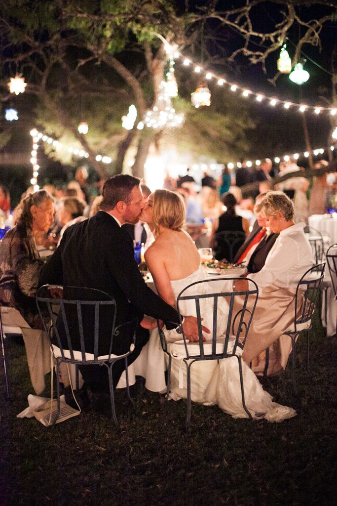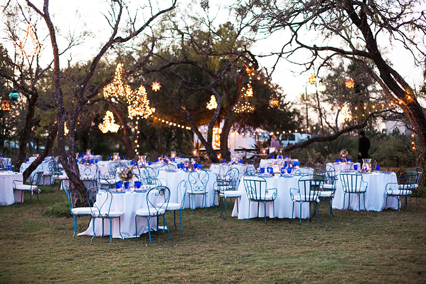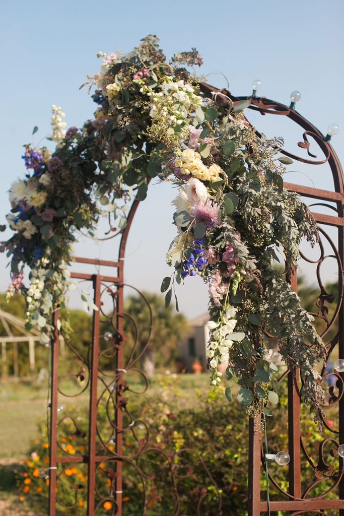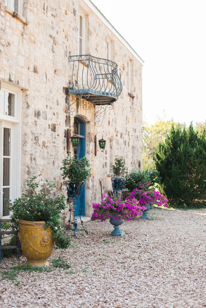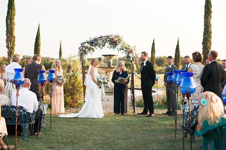THE SETTING: The ceremony was surrounded by gardens as the guests sat in blue wrought iron chairs. The altar was centered in front of a fountain at the end of the aisle. In front of the fount was an arch draped in flowers by Petals, Ink. The entire scene was divine.
