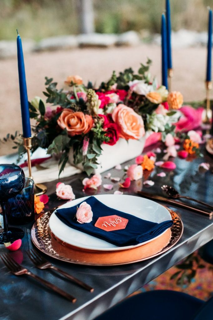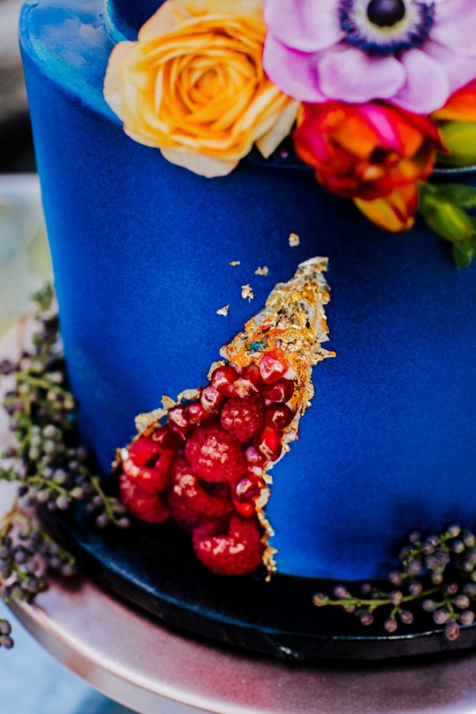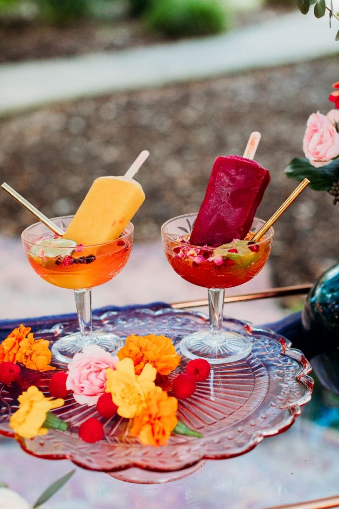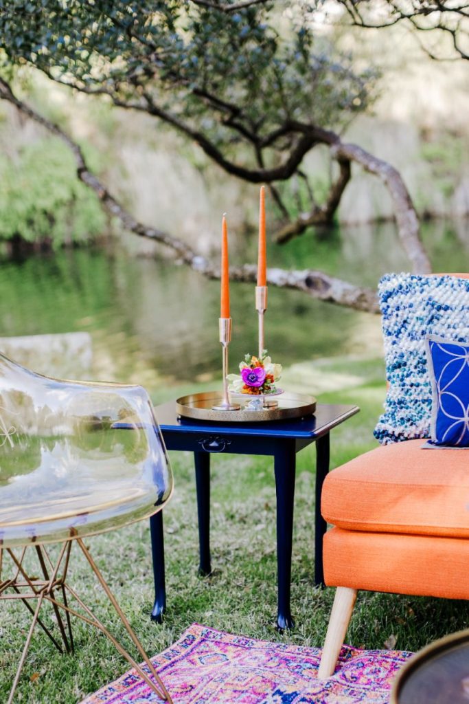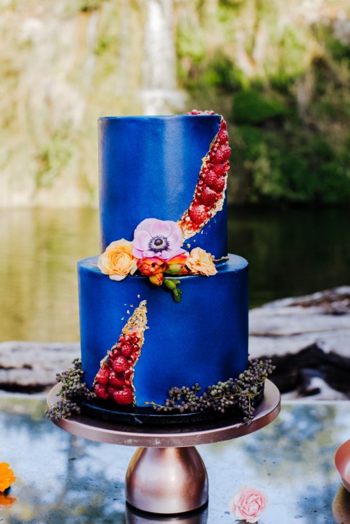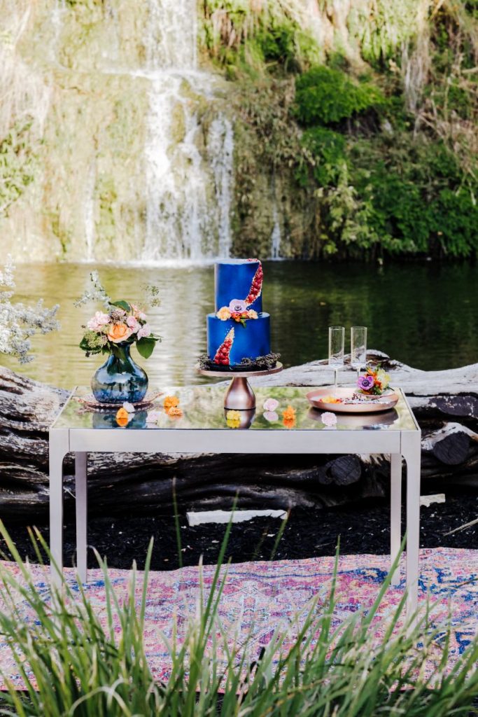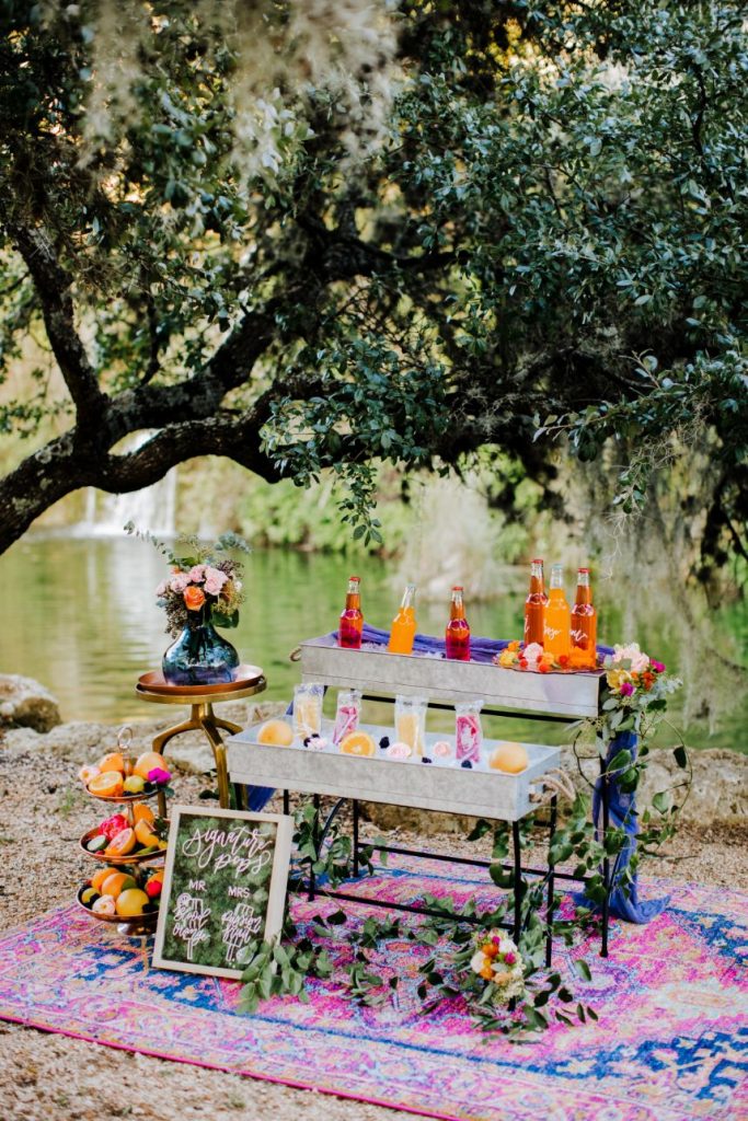 Citrusy details, the brightest florals and deep colors abound in this bold jewel-toned wedding inspiration at the beautiful Hidden Falls! Mixing mod and contemporary-style rentals with boho textiles and heavily saturated florals, this vendor team knocked it out of the park in terms of color and visual interest. There’s not a detail in this entire scene that isn’t fun to look at! We especially love the bold blue cake with the three-dimensional fruit filling detail and the way the fruit theme was carried throughout the tablescape. The florals by Reiley and Rose, from the bride’s colorful bouquet tied with a teal ribbon to the hanging installation between the sweetheart table and oak trees above, are absolutely outstanding! We love the bride’s sultry wedding dress from Beatitude Bridal with its illusion neckline, delicate straps and open back, and Nicole Mera provided stunning custom fine jewelry with colored stones, of course. Everything from the signage to the fun popsicle bar make this bold jewel-toned styled shoot one to remember. Enjoy!