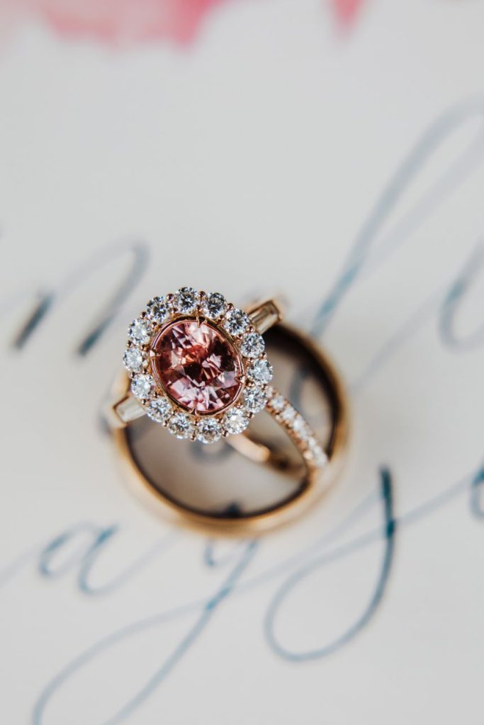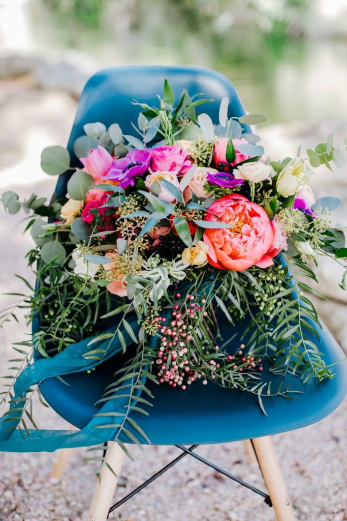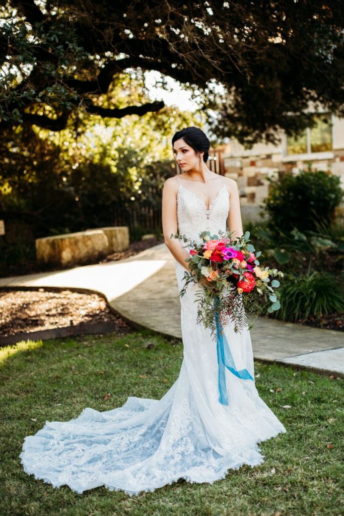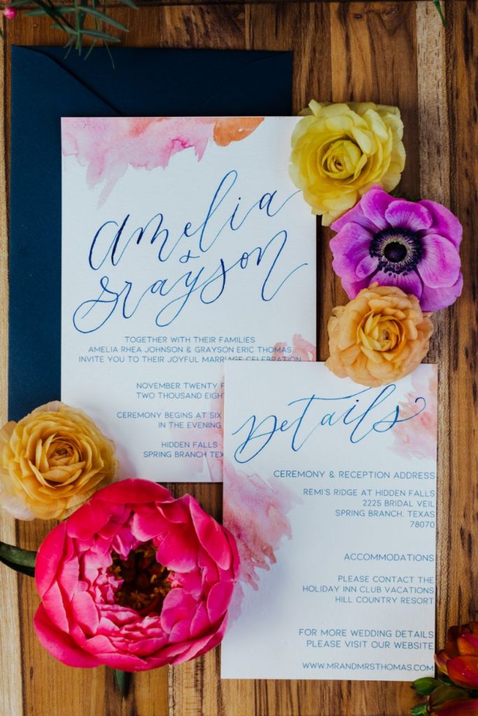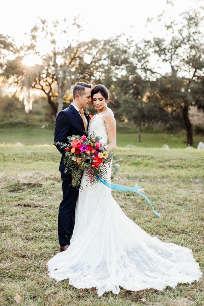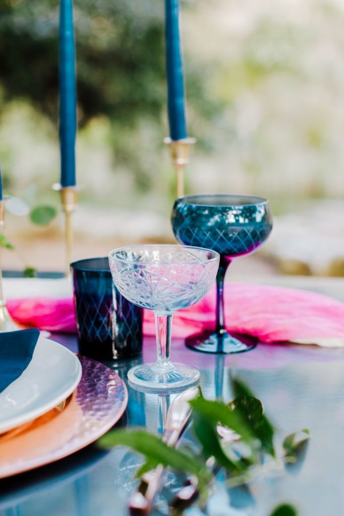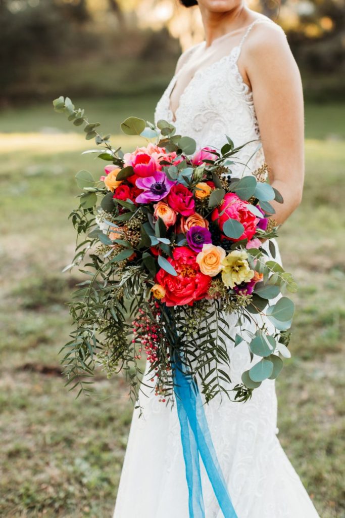 Citrusy details, the brightest florals and deep colors abound in this bold jewel-toned wedding inspiration at the beautiful Hidden Falls! Mixing mod and contemporary-style rentals with boho textiles and heavily saturated florals, this vendor team knocked it out of the park in terms of color and visual interest. There’s not a detail in this entire scene that isn’t fun to look at! We especially love the bold blue cake with the three-dimensional fruit filling detail and the way the fruit theme was carried throughout the tablescape. The florals by Reiley and Rose, from the bride’s colorful bouquet tied with a teal ribbon to the hanging installation between the sweetheart table and oak trees above, are absolutely outstanding! We love the bride’s sultry wedding dress from Beatitude Bridal with its illusion neckline, delicate straps and open back, and Nicole Mera provided stunning custom fine jewelry with colored stones, of course. Everything from the signage to the fun popsicle bar make this bold jewel-toned styled shoot one to remember. Enjoy!