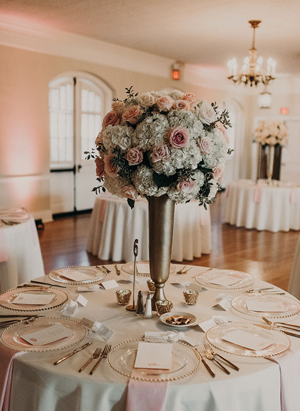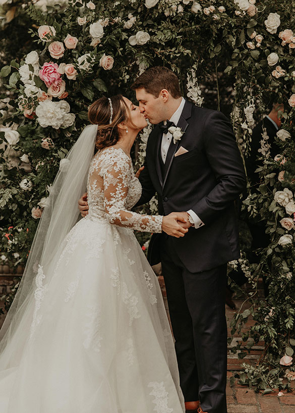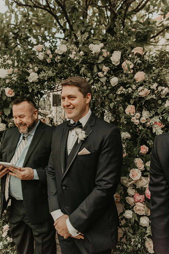 This breathtaking al fresco wedding ceremony caught our attention with the elegant blush pink florals and romantic altar. Alexandria Manglaris and James Gibbs’ wedding is totally swoon-worthy! We are melting over the groom’s face of pure excitement when he saw his stunning bride coming down the aisle – the moment was captured so beautifully by Nikk Nguyen Photo. From the gorgeous ceremony to the elegant reception, Premiere Events was a one-stop-shop for all decor and rentals for the Gibbs’ big day. The only thing that would make scrolling through these beautiful images better would be if we had a slice of that delicious cake from Sweet Treets Bakery! Come take a peek into Mr. and Mrs. Gibbs’ dreamy day below.