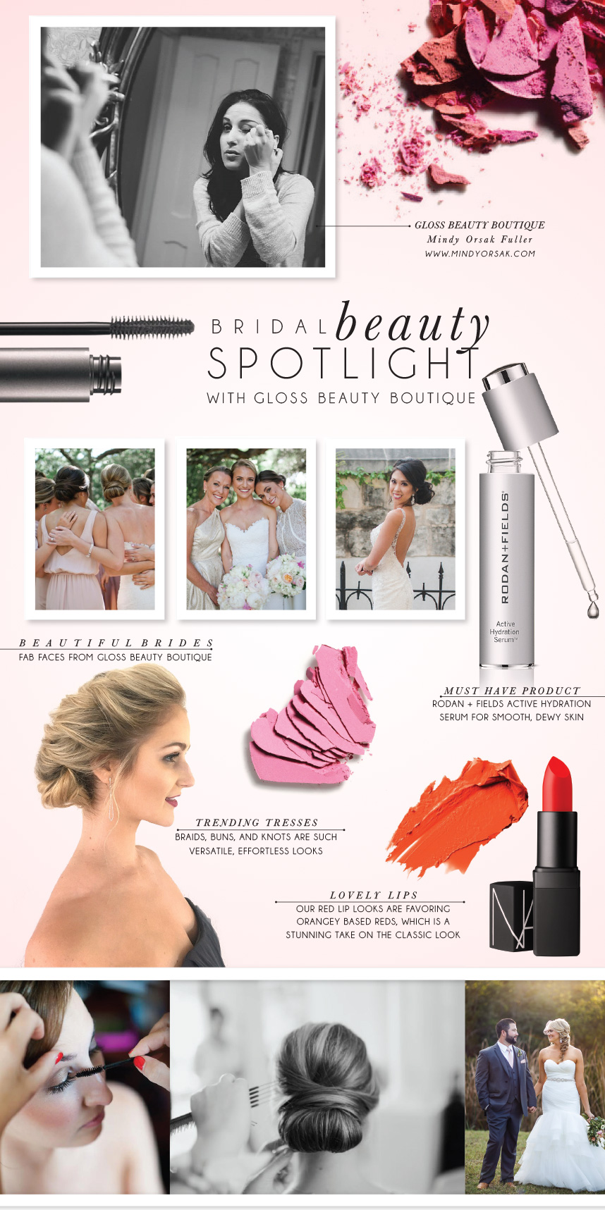 Beauty insight for the big day is on every bride’s mind, so we sat down with Austin wedding hair and makeup artist Mindy Orsak Fuller from Gloss Beauty Boutique to bring you the 411 on the latest bridal beauty tips and trends! Read on for her expert advice and a few helpful tricks to make sure you’re every bit the blushing bride on your wedding day!