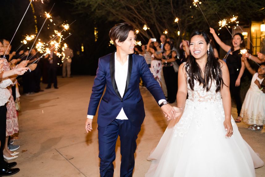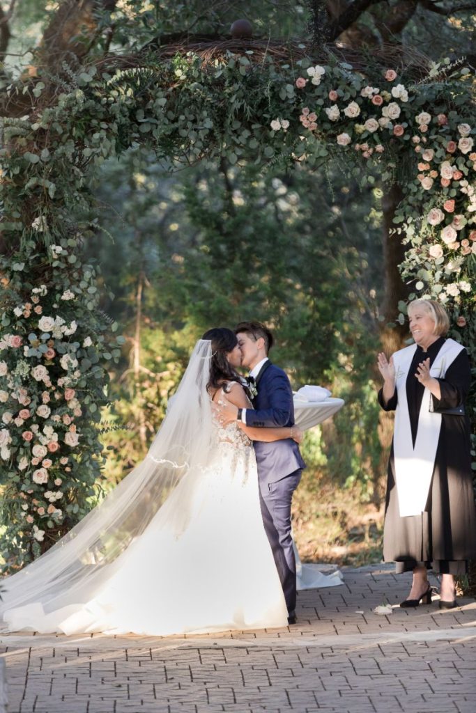 From the brides: “Our favorite part was saying our vows. People asked us if we knew about each other’s vows because they complemented each other. We didn’t. I guess knowing someone for a long time makes you think alike.”