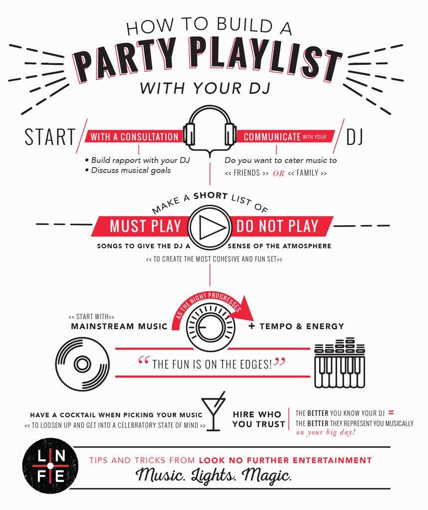 Start with a consultation. This is a great way to build rapport with your DJ, to discuss your musical goals for the event and to determine if they’re the right fit. It’s also a great opportunity to start working on your must play list, your don’t play list and everything in between. At LNFE we perform a custom live demo at every “in person” meeting to give them a basis for comparison and to get them excited about their event! For clients planning from out of town, we’re also very comfortable getting things done electronically, on the phone or via Skype.