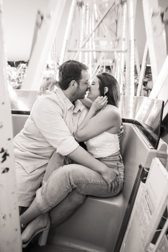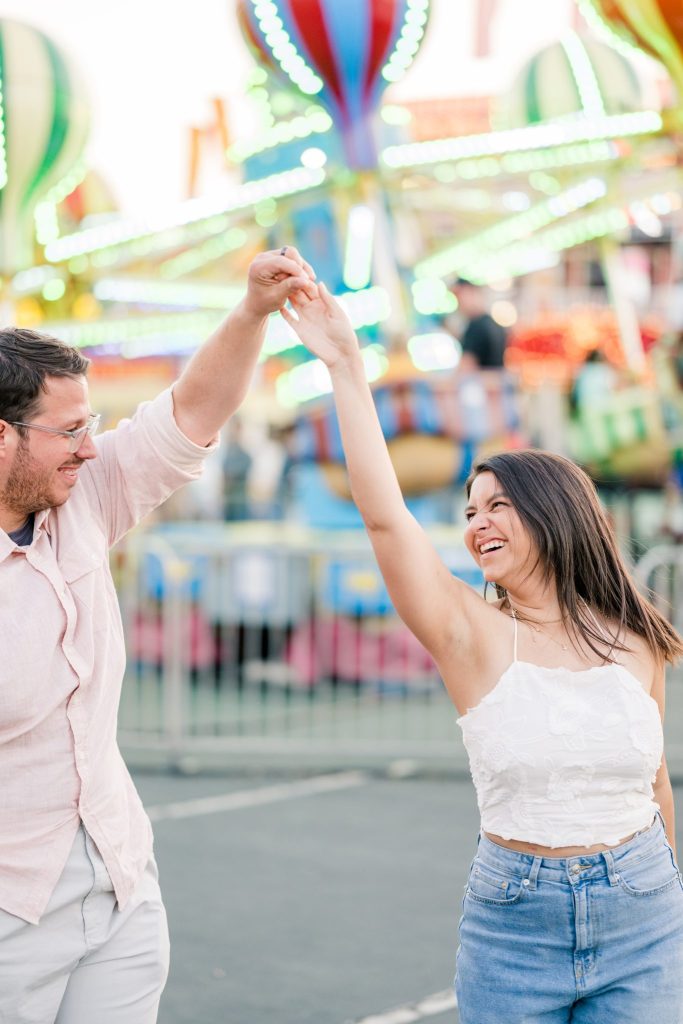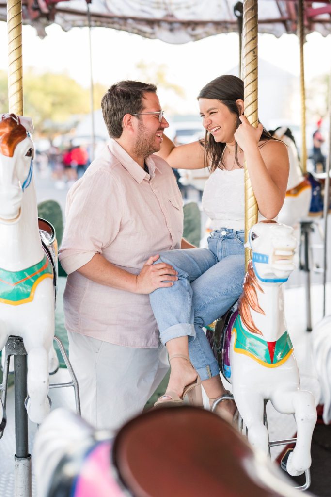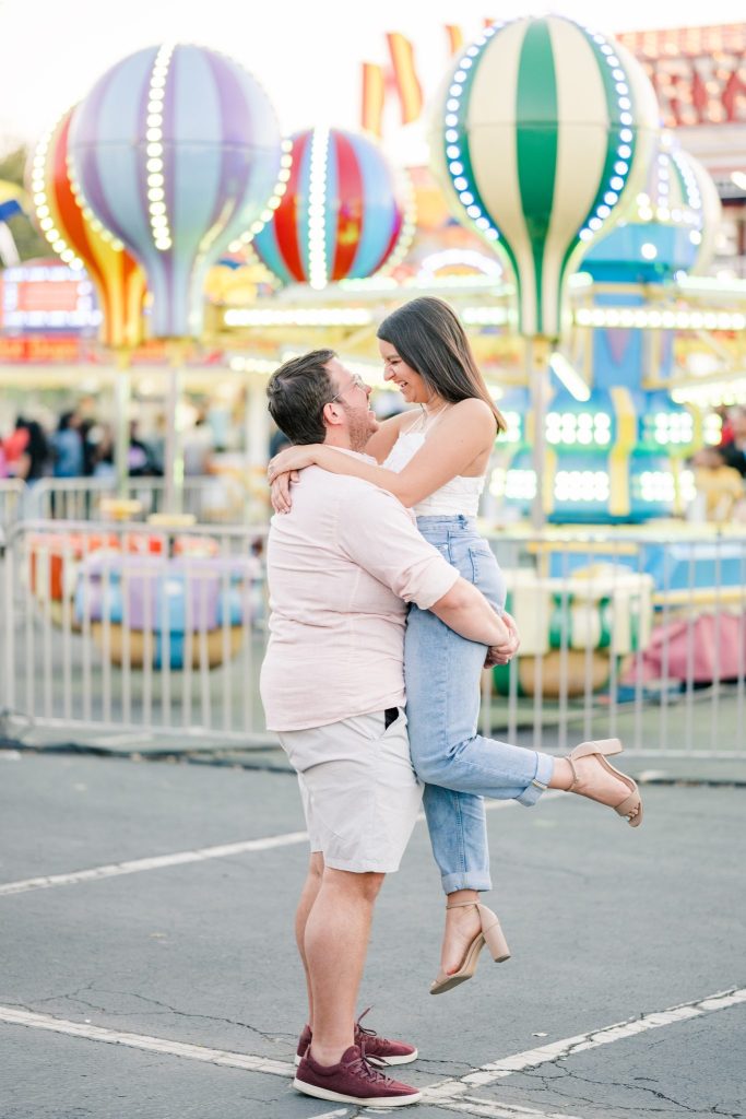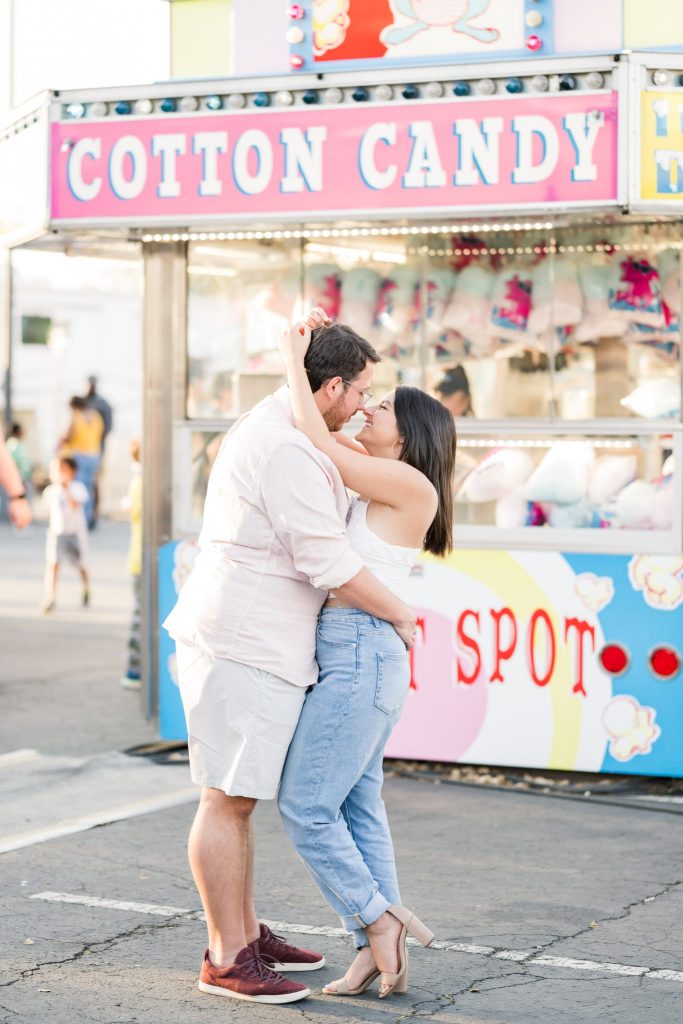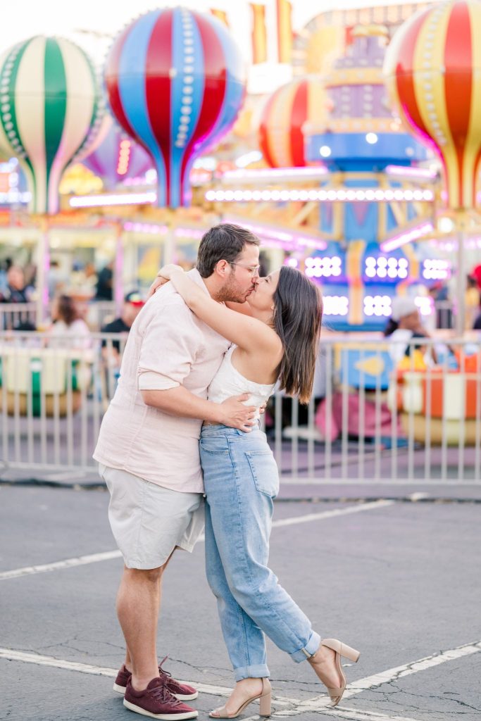 The carnival pictured in Cayla and David’s photoshoot is The Mighty Thomas Carnival, one of Cayla’s favorite carnivals since she was three years old. Cayla said, “The carousel, the balloon ride, and the midway map the footsteps of my childhood, and I spent hours of my life enjoying them. In true coming-of-age evolution, I loved it as a kid, kind of hated it as a teen, and miss it all the time now. Therefore, this session means a lot to me because while most people feel nostalgia for their hometown, this is mine.”