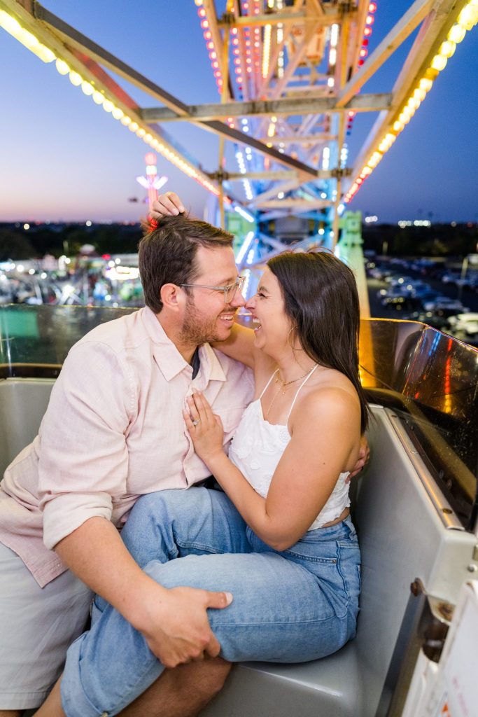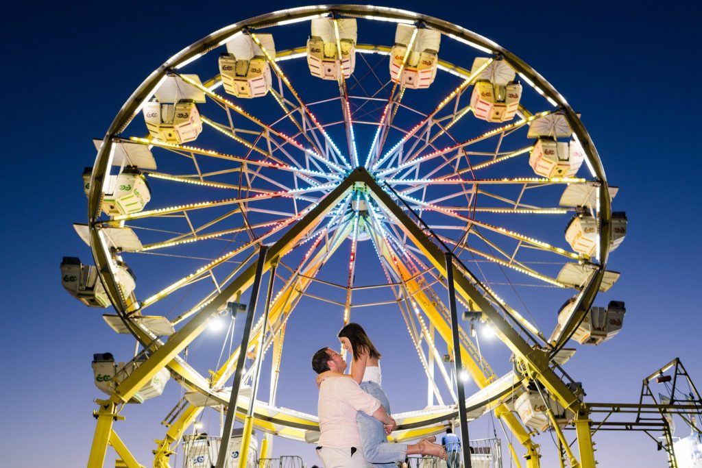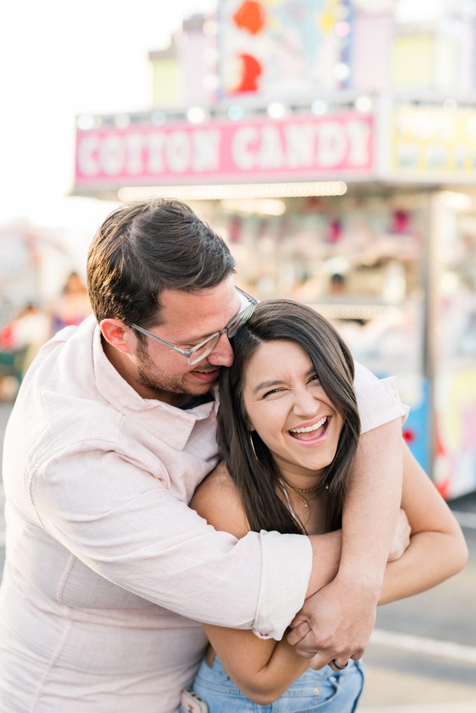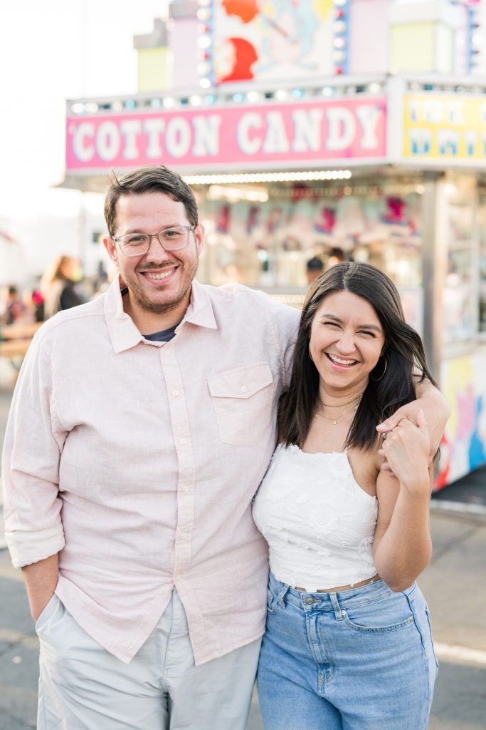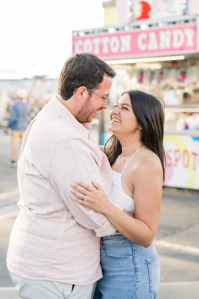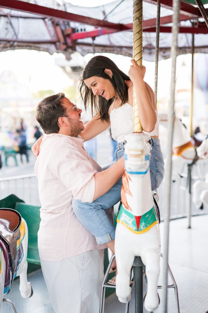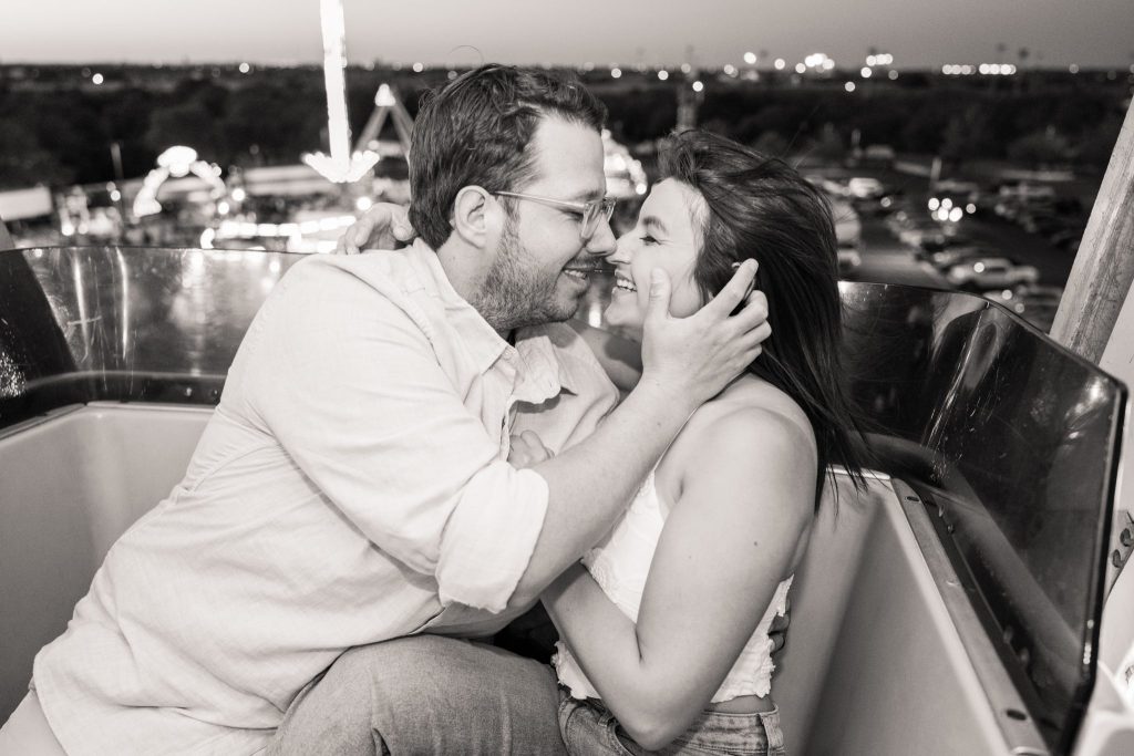 The carnival pictured in Cayla and David’s photoshoot is The Mighty Thomas Carnival, one of Cayla’s favorite carnivals since she was three years old. Cayla said, “The carousel, the balloon ride, and the midway map the footsteps of my childhood, and I spent hours of my life enjoying them. In true coming-of-age evolution, I loved it as a kid, kind of hated it as a teen, and miss it all the time now. Therefore, this session means a lot to me because while most people feel nostalgia for their hometown, this is mine.”
