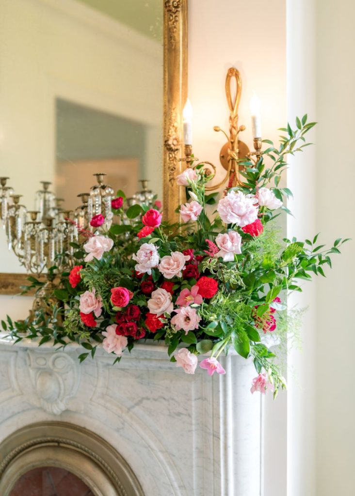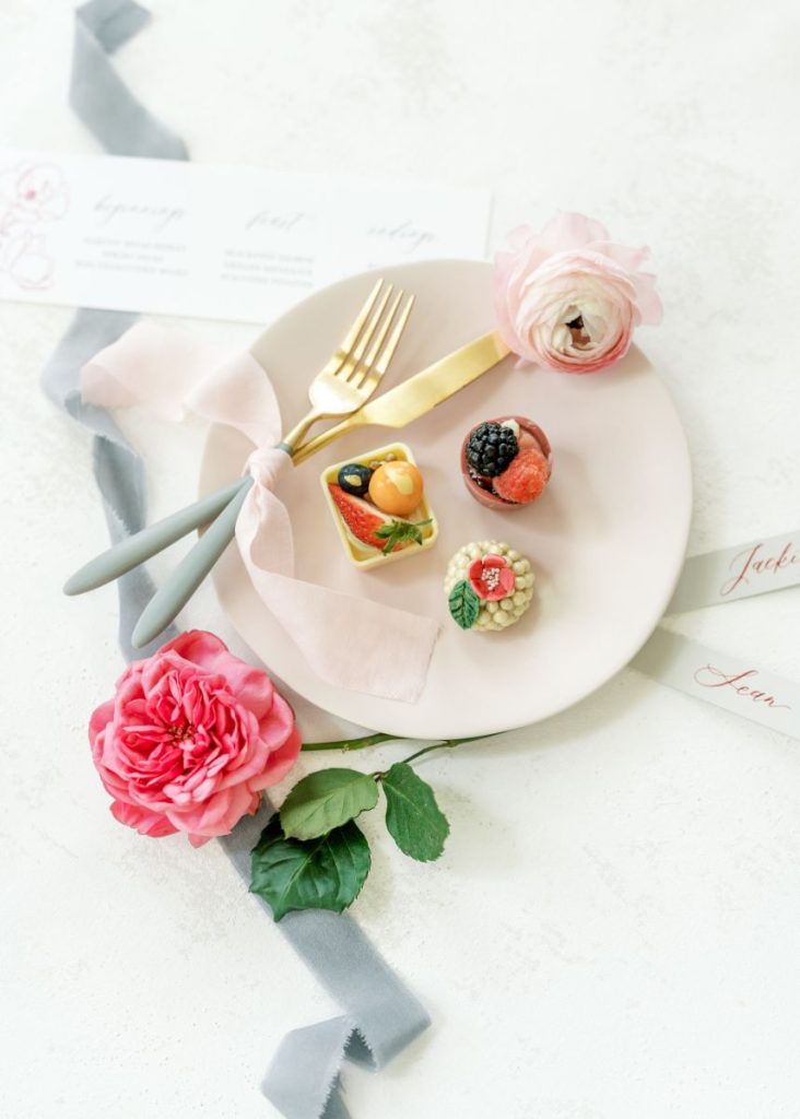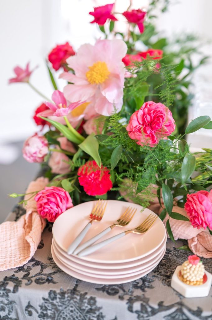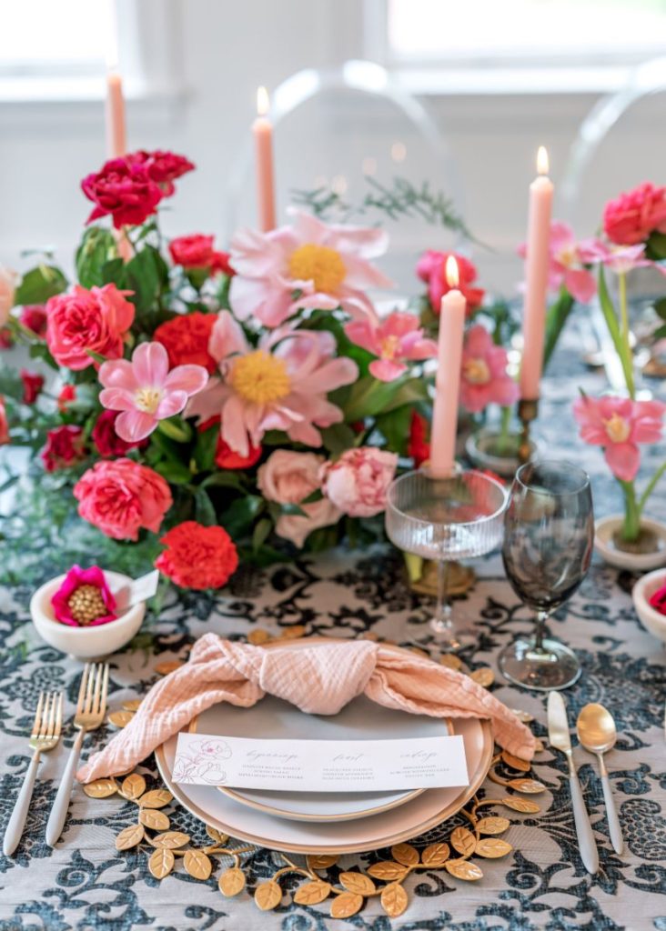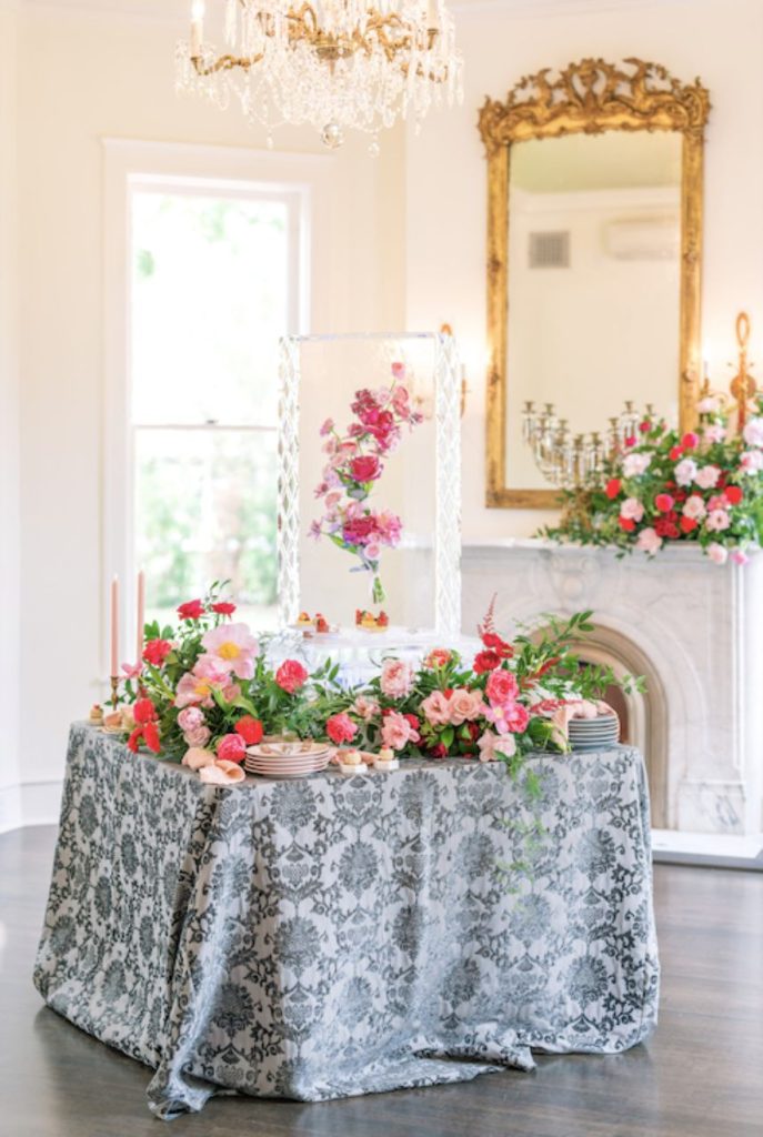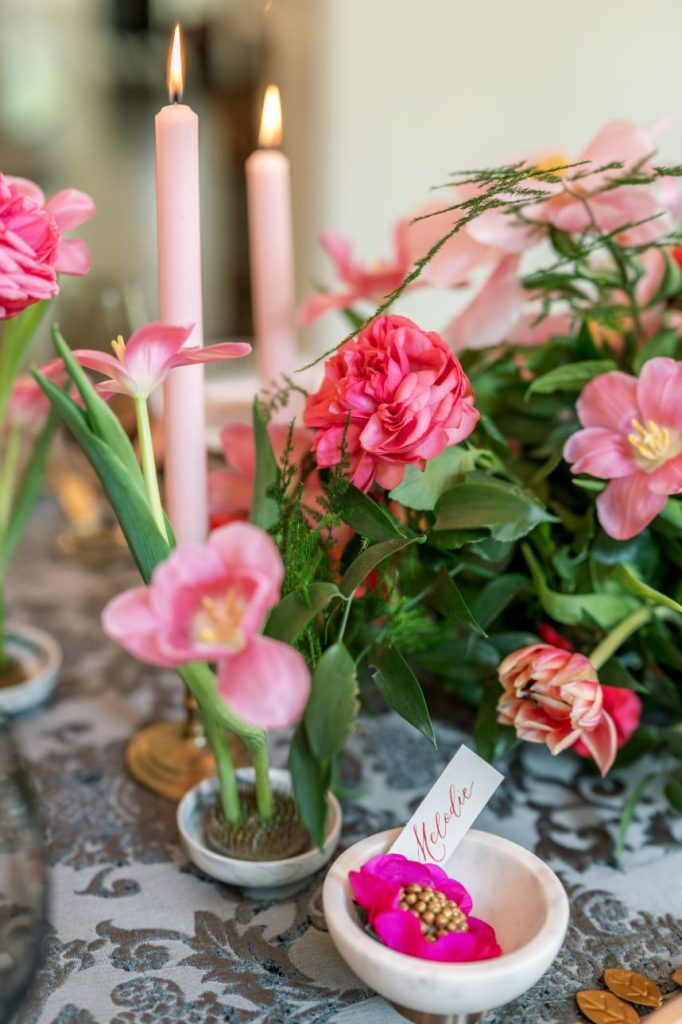 From planners Erica and Kristin with Kristin Catter Events: “We really wanted to merge the traditional bride with a modern twist of color and showcase that both can truly be timeless and classic. Our big focus was finding all aspects that could show that partnership; The Woodbine Mansion itself is a historic downtown Round Rock home converted to a modern-day venue and played a huge role in our overall inspiration. Because all things velvet have been having a serious moment, it was really important to have that fabric present, by adding linen with a dark grey velvet scroll print and softened with delicate pink napkins and dinner plates. It laid out the perfect classic color palette so our golds and vibrant pink details could truly shine and pop. It was extremely important to also show that whether you’re a modern bride with a sleek and clean form-fitting dress or a more traditional bride with a blush-toned ball gown you can still be both modern and traditional from your dress to hair and makeup and maybe even a floral belt for that extra pop. Being that the tradition of a wedding cake is being rewritten into an array of different desserts we really wanted to show that you can still make a BIG statement without a big cake. There’s literally no louder statement than bite-sized brigadeiros served around a beautiful centerpiece of bright pink flowers frozen inside ice with the same live flowers surrounding it, kind of like they’re frozen in time.”