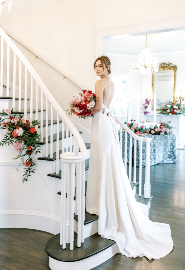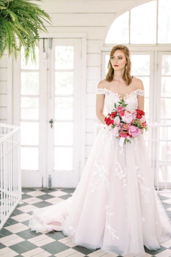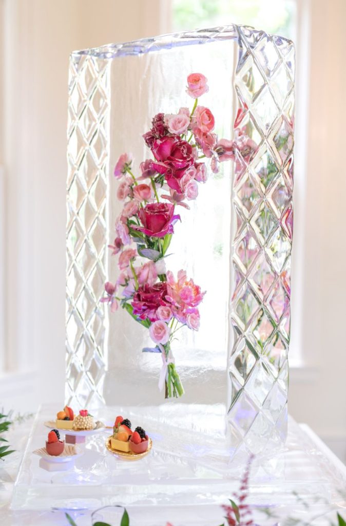 As the summer months come to a close in a lovely change of season, transitional wedding inspiration is in high demand and we have just the editorial for our winter-to-spring couples to set sights on. Designed and styled by Kristin Catter Events, fine art details and classic florals come together to create a nuptial look like no other that Reagan Wright Photography managed to capture so beautifully. A palette of ice blue beneath punchy pink peonies gives the illusion of winter fading to spring – the perfect transitional wedding color scheme. The Bloom Bar created tastefully placed floral installations all around The Woodbine Mansion where their cheerful palettes seemed to bring warmth indoors. A centerpiece of bright pink flowers frozen inside an incredible ice sculpture by Full Spectrum Ice Sculptures with the surrounded by the same live blooms made for a breathtaking focal point in the room, but we still couldn’t ignore the bite-sized brigadeiros from Bonjour Brigadeiro Handcrafted Chocolates & Treats dressed to the nines for the occasion and looking as delicious as ever. Tables, linens and seating from Marquee Event Rentals created the most intimate and mod reception vibes while place settings from Table Manners made each guest feel welcomed with a touch of luxury. There they could obsess over the Owl & Envelope paperie that announced what was on the menu and more in various spots and detail shots from this styled affair. Our bride models two different looks with gowns from Belle Saison Bridal accessorized with a stunning veil, and later a fresh floral belt for an extra touch of whimsy! Sunny Hair and Makeup went bold and beautiful with a half-up and scarlet lip combo for one look while keeping things fresh and dewy for the next with a low updo to pair with. Bring the luxe garden indoors as winter gives way to beautiful spring in this mansion wedding inspiration. Read on for a note from a few of the incredible vendors that brought this transitional wedding editorial to life. Cheers!