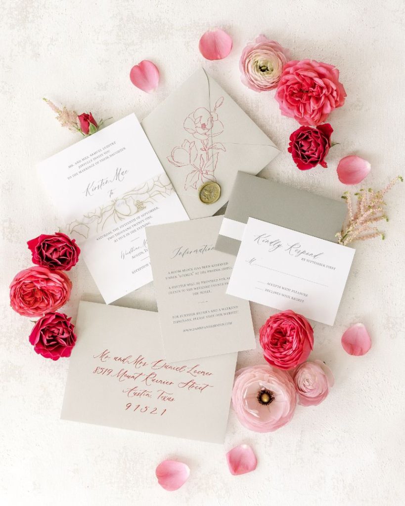 From invitation designer Megan with Owl & Envelope: “This is a great invitation for the bride who wants a classic look with just a touch of personality. I kept the layout and main design of the invitation fairly traditional but added some fun touches throughout in the gold floral belly band, and the hint of pink on the outer envelope. My favorite part of this suite, though, would be the velvet envelope liner. I love using a non-paper material to bring texture and luxury to an invitation suite!”