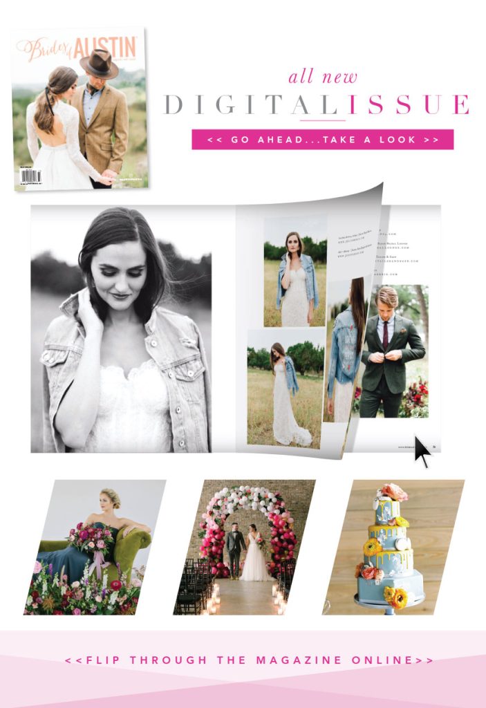 With the release of the Fall/Winter 2017 issue, we are thrilled to once again share our online issue with all our lovely brides-to-be! Chock full of the most incredible wedding inspiration in the Austin area, you’ll find our dreamy Untamed bridal fashion editorial (pg 62), The Love Scene Collection featuring local wedding planners and rental companies (pg 102), stunning invitation suites inspired by Austin wedding venues (pg 143), our Beauty + Blooms editorial where hair and makeup meets fab florals (pg 157), our cake baker spotlight (pg 187), 100+ pages of real ATX weddings and more! The online mag is the best way to see a more in-depth look at the pages of Brides of Austin on the go! Click here to get to the mag now, OR head to the online issue now on Facebook here (under Digital Issues on sidebar)! Happy Friday!