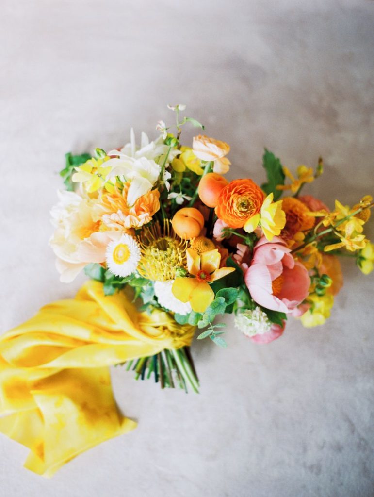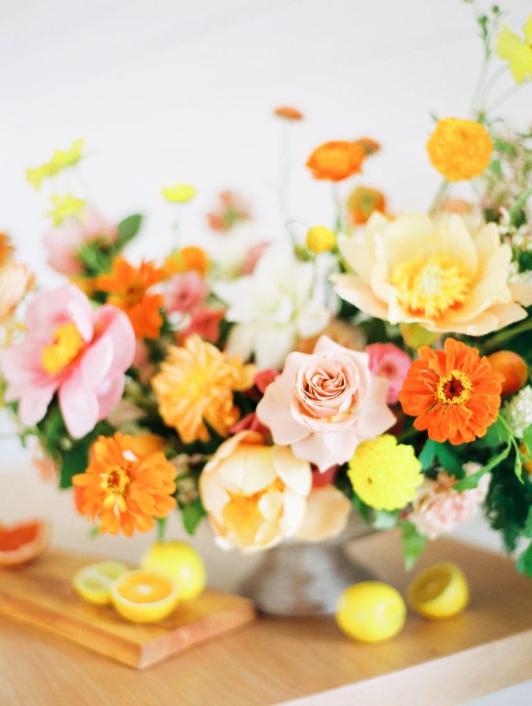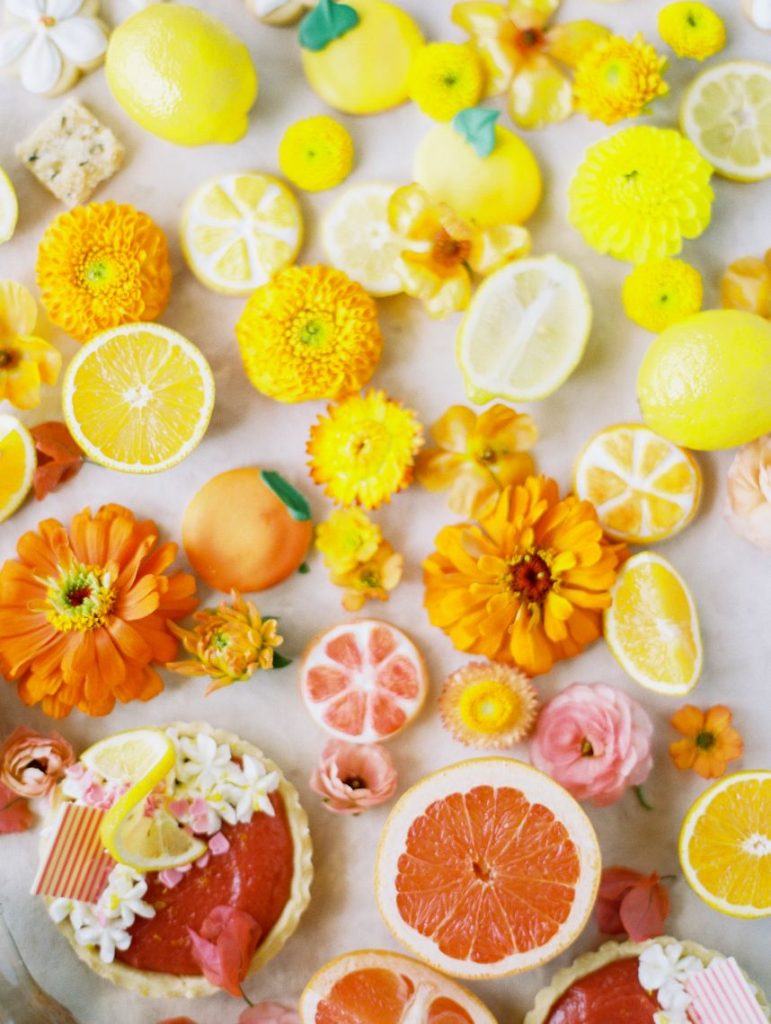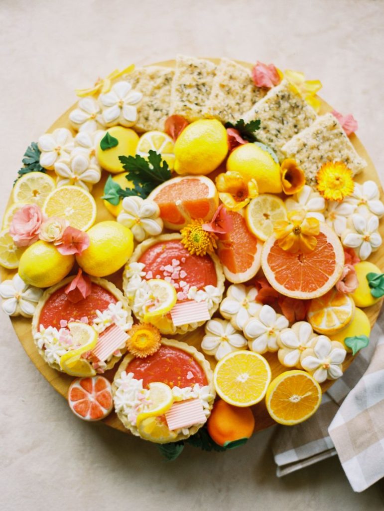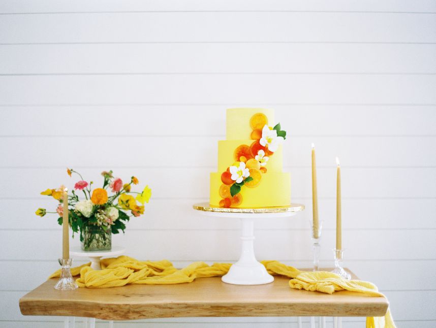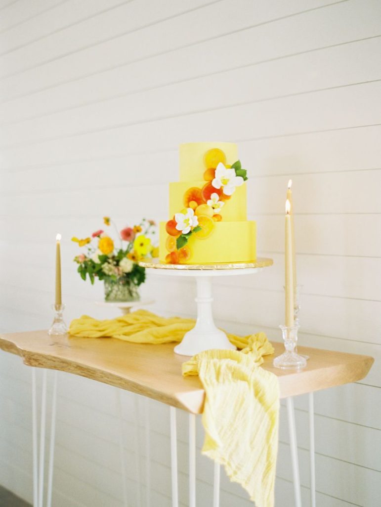 From the planner, Ellen Westcott of Westcott Weddings: “I love the pop of bright, happy and fresh colors that citrus brings to a palette and wanted to design something sophisticated and whimsical that highlights all of those beautiful spring and summer tones. Those colors were translated into the happiest, citrus-inspired florals. I wanted the flowers and paper goods to sing, so I kept everything else neutral. The stunning cake was adorned with candied orange slices, mini citrus touches and beautiful sugar flowers. All of my dessert dreams came true with a dessert ‘charcuterie’ board.”
