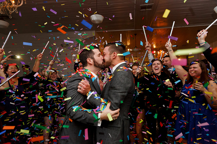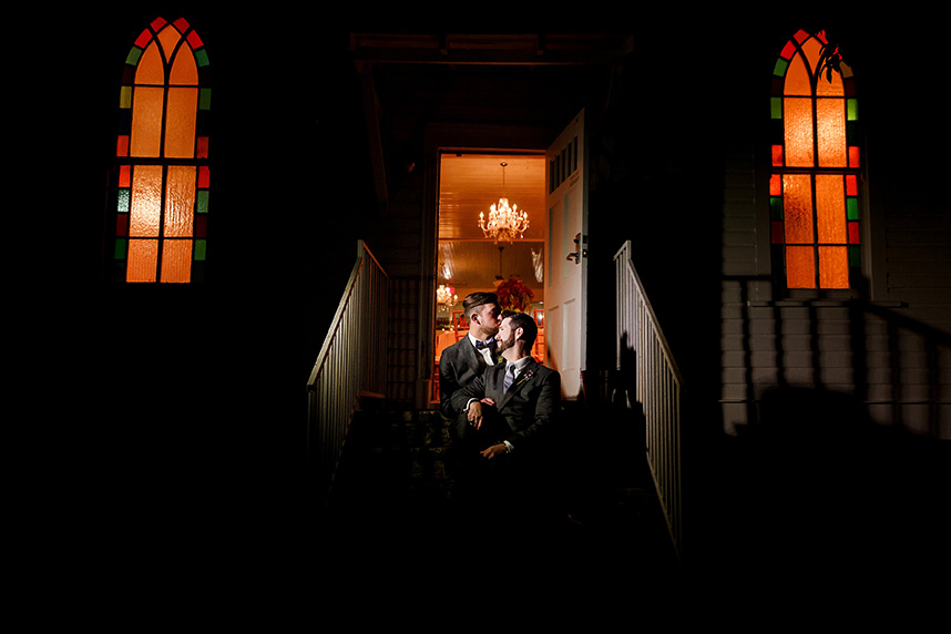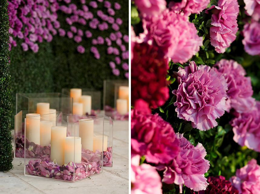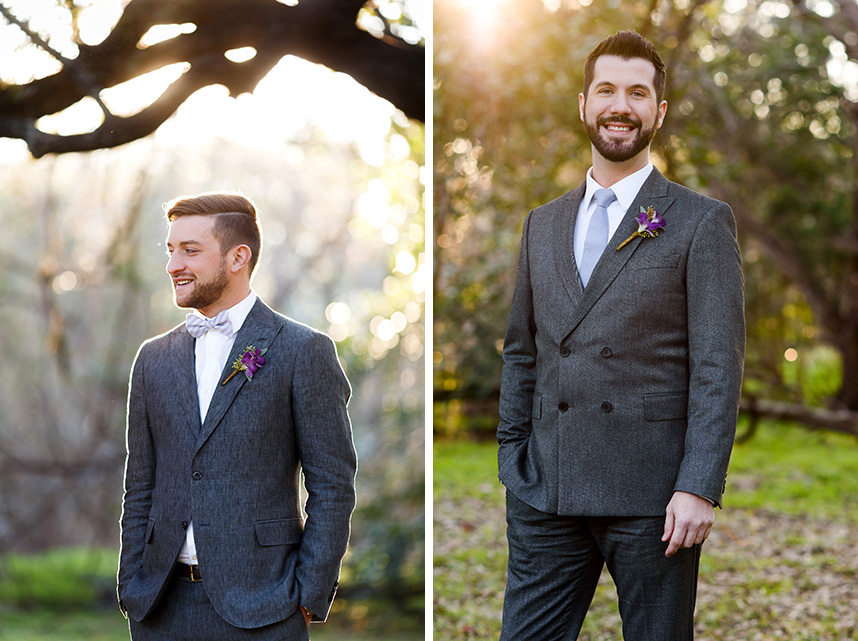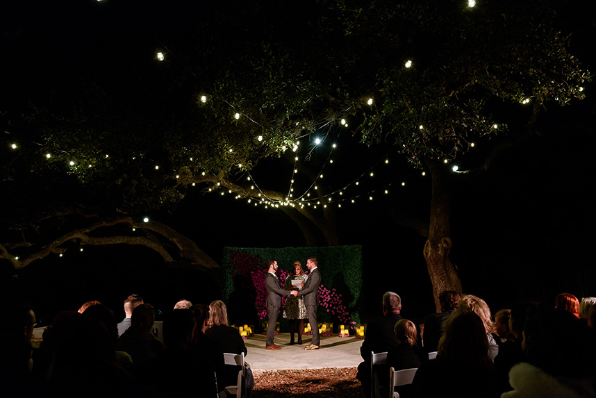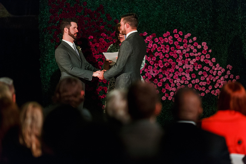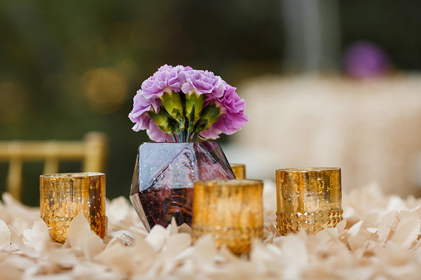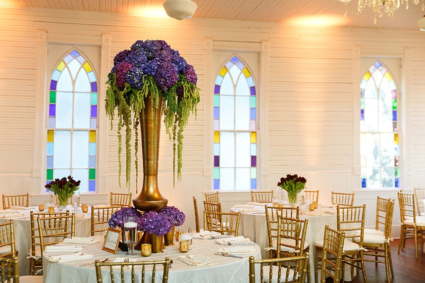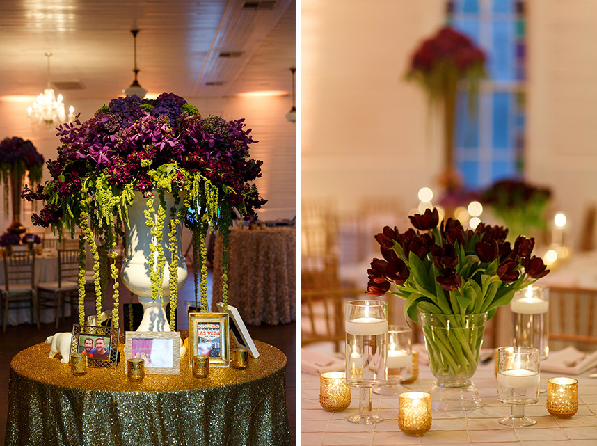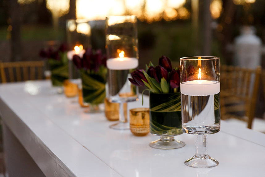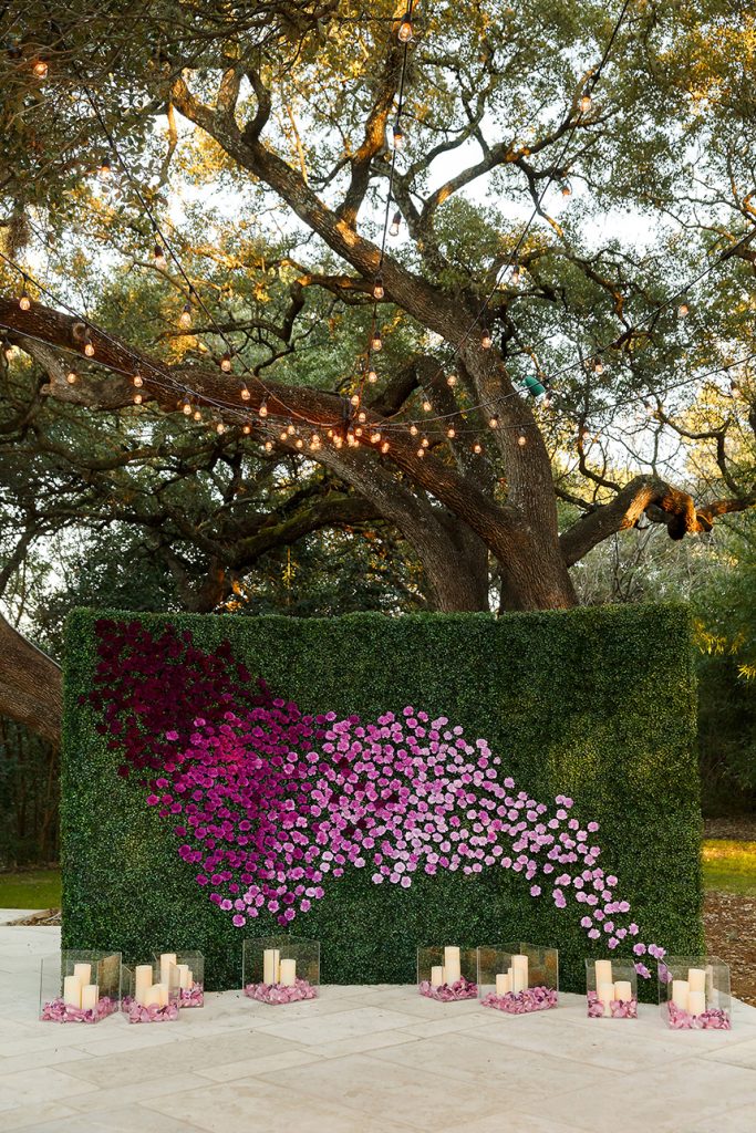 We can hardly contain our excitement when we come across an extravagant scene like this ombre floral backdrop Westbank Flower Market created for one of their own, Tyler, and his new hubby Cody! Their classic, candlelit Austin wedding planned by Pearl Events Austin was infused with dramatic and modern details like this unique altar and abstract vases and decor. The sweet couple was married after the sunset in a stunning outdoor ceremony lit solely by hanging bistro lights and candlelight. After the moving ceremony, the party moved into both a tented space and Mercury Hall’s chapel-like space; both scenes were filled once more with an abundance of candles, deep-purple tulips, and champagne, textured linens from Premiere Events. Simon Lee Bakery created a cake trio for the reception including three of our favorite cake trends – a naked cake, textured icing and a gold foil cake. Take a peek at Tyler and Cody’s decadent, violet-hued soiree below! Cheers!
