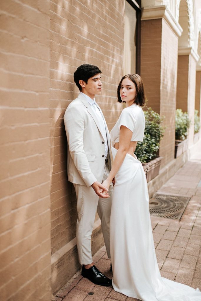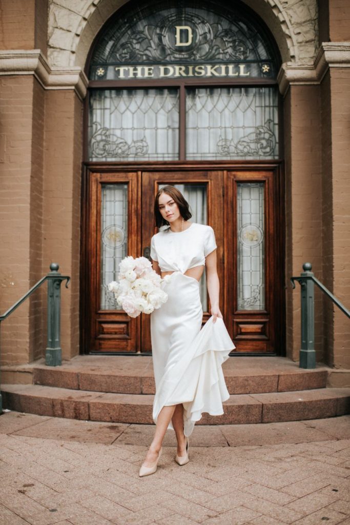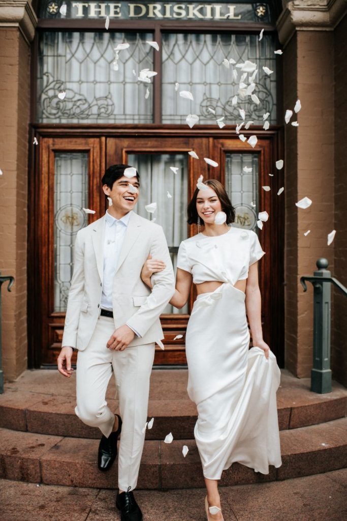 The gowns in our newest fashion editorial, Classique Chic, are so much more than wedding dresses – they’re works of art! Every year we can hardly wait to see what brides are wearing down the aisle, and if you’re in need of some inspiration, just take a look at these modern yet timeless gowns newly released by top designers that are just perfect for the upcoming wedding season. This intimate elopement editorial captured by Annique Marie Photography around the iconic downtown Austin venue The Driskill shows off fine jewelry from local artisan Form to Feeling as well as show-stopping gowns from some of our favorite Austin bridal shops like a&bé bridal shop Austin and Unbridaled. Plus, get the inside scoop from Crown of Glory Beauty on how each 90s inspired style was paired with just the right hair and makeup to match. Flora Fetish created a creamy bridal bouquet that goes with every minimalist style as the perfect finishing touch!